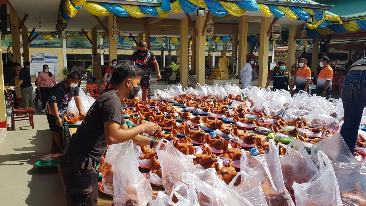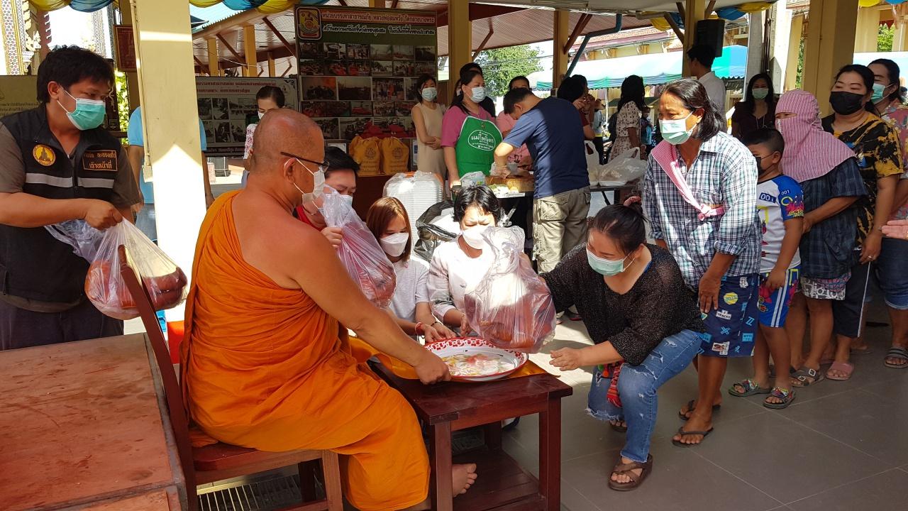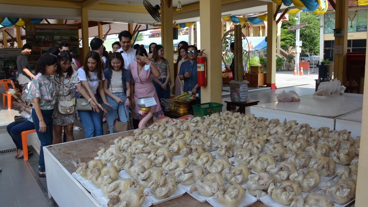 ก่อนกลับ ทั้งคู่ได้ไปรวมตัวกับพระครูศรีสุตากร เจ้าอาวาส เพื่อแจกหัวหมูและไก่ต้มที่นำมาแก้บน ให้กับสาธุชนที่มากราบไหว้ และชาวบ้านผู้ยากไร้ที่มารอรับทาน เพื่อเสริมบุญอีกทอดหนึ่ง ซึ่งมีชาวบ้านกว่า 200 คน มารอเข้าแถวรอรับแจก.