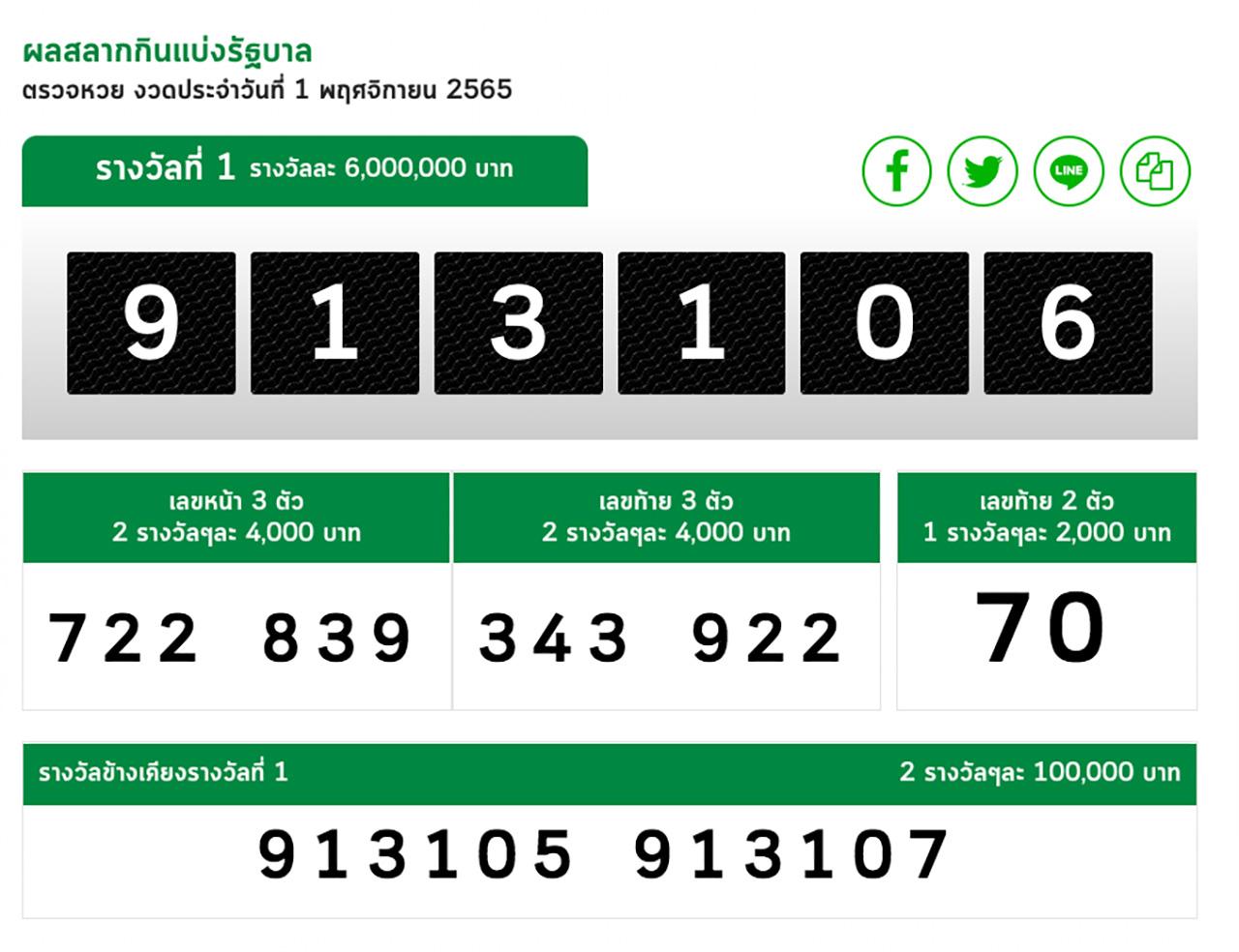 วันที่ 16 พ.ย. 65 ผู้สื่อข่าวรายงานว่า หลังการออกสลากกินแบ่งรัฐบาล งวดประจำวันที่ 16 พ.ย. 2565 พบว่า "ลอตเตอรี่รางวัลที่ 1" รางวัลละ 6,000,000 บาท ออกหมายเลข 121789