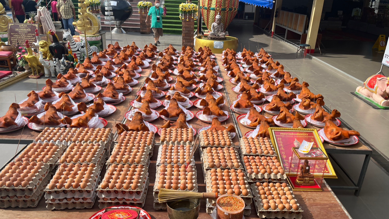จากการสอบถาม น.ส.มาลีรัตน์ ผลเจริญ อายุ 37 ปี อาชีพค้าขายส่วนตัว ได้เดินทางมาพร้อมครอบครัว นำหัวหมู 99 หัว ไข่ไก่ 3,000 ฟอง ใส่รถมาถวายแก้บนหลวงพ่อสมหวัง เนื่องจากที่ขายที่ดินได้ เผยว่า ได้มากราบไหว้ขอพรจากหลวงพ่อสมหวัง ทำให้ขายที่ดินได้ เนื่องจากเคยบอกขายมานานแต่ไม่มีคนซื้อ ในช่วงเศรษฐกิจไม่ดีที่ผ่านมาใช้เงินเยอะประคองธุรกิจ ที่ทำอยู่แทบไม่รอด ต้องใช้จ่ายเงินมากจนแทบไม่มีเงินหมุนเวียน