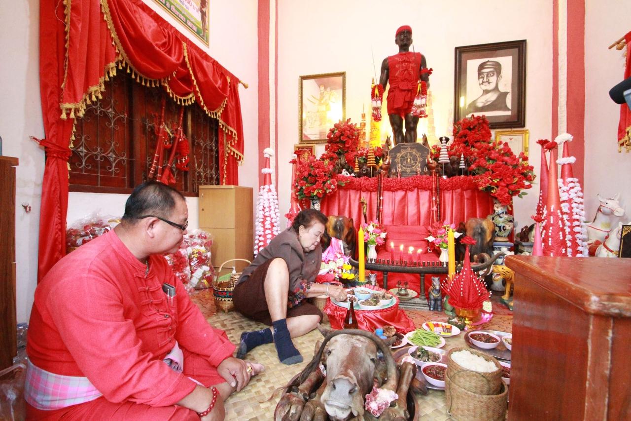 ด้าน นางสุเพ็ญศรี ยิ่งผล อายุ 79 ปี ที่ชนเผ่าผู้ไทยเรณูนคร เรียกว่า เจ้าจ้ำ หรือร่างทรงปู่ถลา กล่าวว่า ศาลเจ้าปู่ถลา ถือเป็นที่ยึดเหนี่ยวจิตใจชาว อ.เรณูนคร ที่เป็นชนเผ่าผู้ไทย เชื่อว่าสามารถคุ้มครองปกปักรักษาให้ประชาชน มีความร่มเย็นเป็นสุข แคล้วคลาดปลอดภัย รวมถึงขอพรให้สมหวังได้ มีหลายคนที่มาขอพรแล้วประสบความสำเร็จ อาทิ การขอให้ลูกหลานสอบเรียนต่อ หรือสอบเข้าทำงานได้ ซึ่งเป็นเรื่องเหลือเชื่อมีหลายคนได้ตามคำขอพรมาแล้ว ทำให้ในทุกปีจะมีผู้ที่เลื่อมใสศรัทธานำวัวเป็นตัวมาเชือด ถวายแก้บนตามที่ได้ขอพรเจ้าปู่ถลา สมความปรารถนา เฉลี่ยวันละไม่ต่ำกว่า 1 -2 ตัว ยกเว้นวันพระ โดยจะนำมาชำแหละสดๆ นำหัววัว พร้อมด้วย ขาวัว 4 ขา รวมกับหางด้วย ถวายเจ้าปู่ถลาพร้อมทั้งมีลาบเนื้อสดใส่เลือดสดสีแดง จัดพาอาหาร