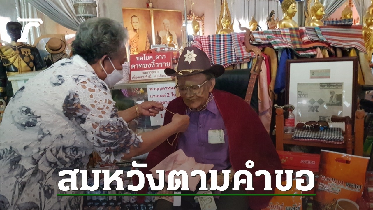 วันที่ 22 ธ.ค. 2565 ผู้สื่อข่าวรายงานว่า ที่วัดสว่างอารมณ์ แคแถว ต.ขุนแก้ว อ.นครชัยศรี จ.นครปฐม ผู้สื่อข่าวรายงานมาว่า นางพยงค์ สารทจีนพงษ์ อายุ 72 ปี บ้านอยู่จังหวัดสิงห์บุรี เดินทางมาพร้อมนำสร้อยคอทองคำหนัก 1 บาท พร้อมข้าวสาร 25 ถุง ถุงละ 5 กก. ไข่ไก่สด 30 แผง ดอกกุหลาบแดง 100 ดอก เครื่องดื่มชูกำลัง 3 โหล น้ำแดง 4 โหล มาแก้บนให้กับ "ตาทอง งิ้วราย" ที่ทำให้โชคดีจากเรื่องที่เหลือเชื่อจากการดูทีวีช่อง 32 ไทยรัฐทีวี เลยบนบานศาลกล่าวต่อหน้าทีวี หุ่นตาทองงิ้วราย ขอให้ขายที่ดินที่บอกขายมานานแต่ขายไม่ได้ เลยบนไว้หากขายได้จะนำทองมาแก้บนให้