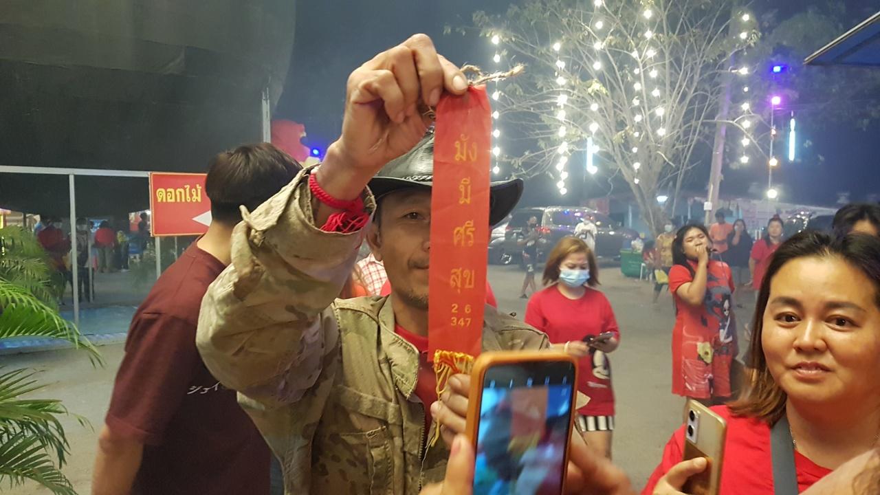 และเมื่อสอบถามแม่ค้าพ่อค้าที่ขายของในวัด ต่างบอกเป็นเสียงเดียวกันว่าถูกกันเยอะมาก เรียกว่าเกือบทั้งหมู่บ้าน จึงได้รวบรวมเงินว่าจ้างดนตรีพิณแคนมาเล่นแก้บน พร้อมรวบรวมเงินมาทำบุญให้วัดด้วย สำหรับหางประทัดชุดนี้ที่จุดเช่นกันหากถูกอีกจะจ้างดนตรีวงใหญ่มาแสดงให้อีกแน่นอน.