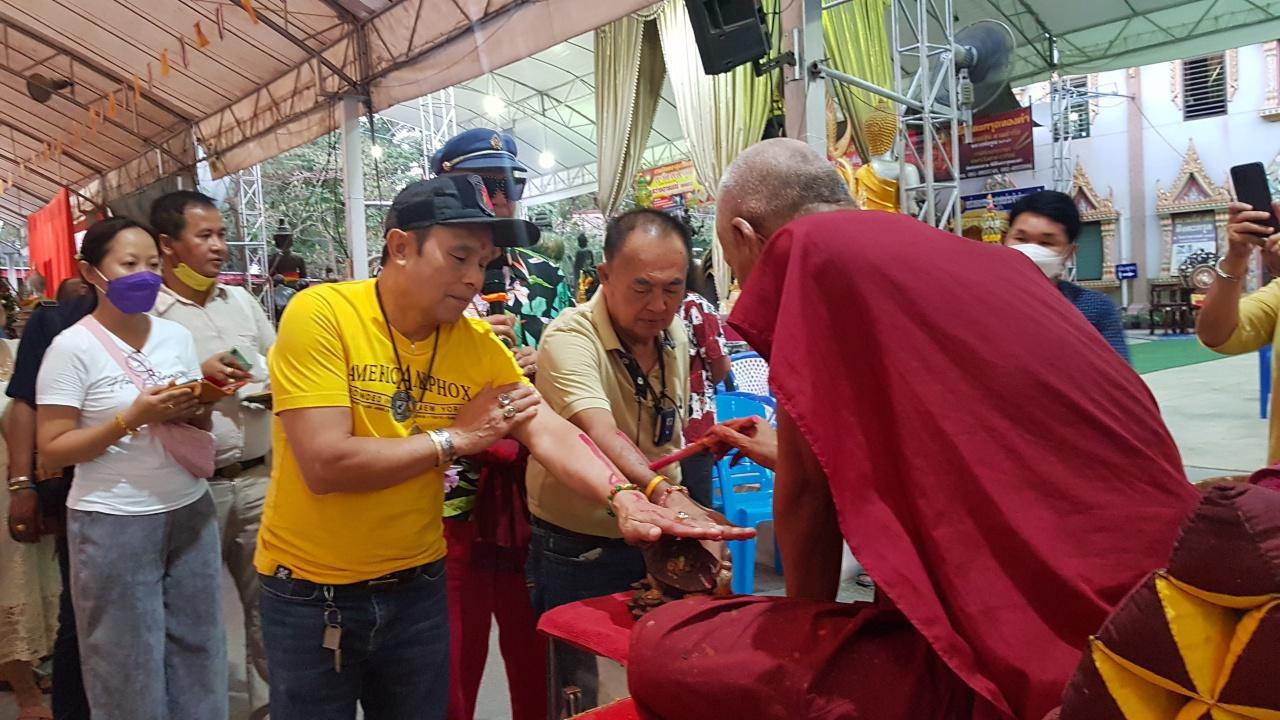 พร้อมทั้ง ตั้งใจมากราบขอโชคจาก ท้าวเวสสุวรรณ ที่เชื่อกันว่าจะบันดาลโชคให้ผู้ที่มาขอ และเข้ากราบพระครูยติธรรมานุยุต หรือ หลวงพ่อแป๊ะ เจ้าอาวาสวัดสว่างอารมณ์ ที่เคยอุปถัมภ์ในสมัยที่ยังไม่มีชื่อเสียง เพื่อขอให้ลงอักขระยันต์หลังฝ่ามือ และเจิมหน้าผากเพื่อความเป็นสิริมงคล ก่อนจะร้องเพลงให้ทุกคนที่มาร่วมงานฟัง ซึ่งได้รับเสียงปรบมือล้นหลาม