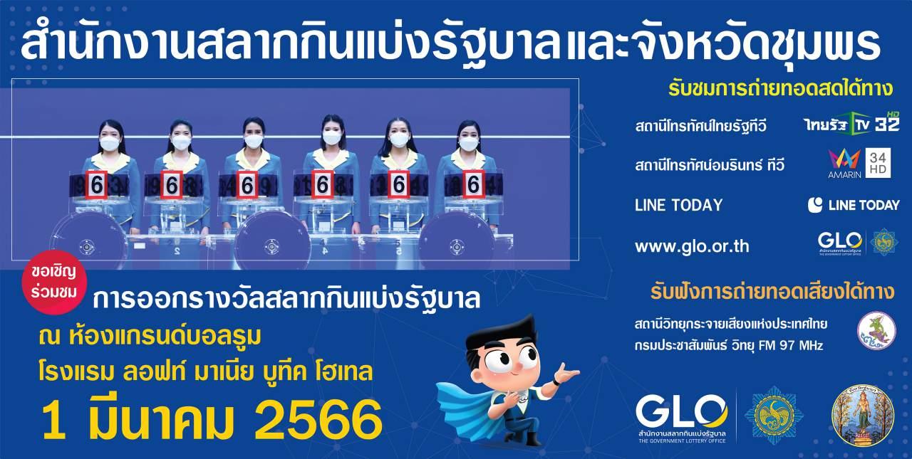 พันโทหนุน ศันสนาคม ผู้อำนวยการสำนักงานสลากกินแบ่งรัฐบาล เผยว่า ในการออกรางวัลงวดวันที่ 1 มีนาคม 2566 สำนักงานสลากกินแบ่งรัฐบาลจะเดินทางไปออกรางวัลสลากสัญจร ณ ห้องแกรนด์บอลรูม โรงแรม ลอฟท์ มาเนีย บูติค โฮเทล อำเภอเมืองชุมพร จังหวัดชุมพร เพื่อเปิดโอกาสให้ประชาชนในต่างจังหวัดได้เห็นขั้นตอนและวิธีการ ตลอดจนอุปกรณ์ที่ใช้ในการออกรางวัลด้วยตนเอง จะได้ไม่หลงเชื่อข่าวลือเรื่องเลขเด็ดจากกลุ่มมิจฉาชีพที่ทำการหลอกลวงต้มตุ๋น ผ่านทางสังคมออนไลน์และการส่งจดหมายแอบอ้างว่าสามารถให้ตัวเลขที่จะออกรางวัลได้