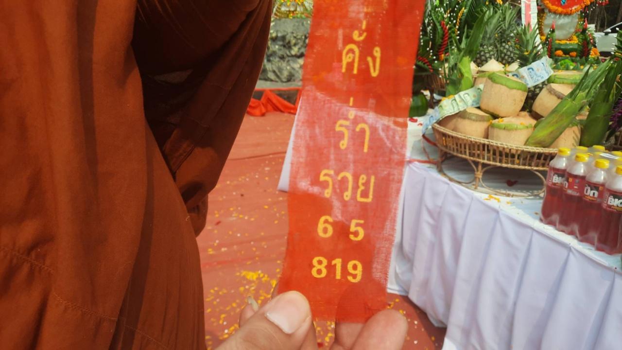 หลังประกอบพิธีบวงสรวงท้าวเวสสุวรรณเสร็จแล้ว มีการจุดประทัดมงคล เพื่อเสี่ยงทาย จำนวน 1,000 นัด จนเสียงดังก้องป่า เมื่อหมดประทัด คอหวยต่างกรูกันไปขอถ่ายภาพหางประทัด ซึ่งปรากฏเป็นเลข 819, 918, 65, 56 เนื่องจากจะได้นำไปเสี่ยงโชคในงวดวันที่ 16 เม.ย.2566 นี้ด้วย.
