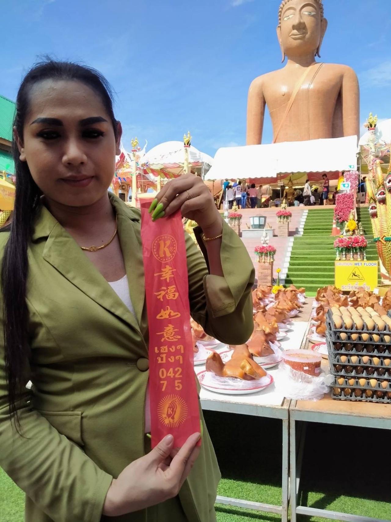 น.ส.รักษณาลีย์ เผยหลังเสร็จสิ้นพิธีบวงสรวงว่า ตนเองประกอบอาชีพผลิต และค้าขายเครื่องสำอาง ในช่วง 2 ปีที่ผ่านมา ธุรกิจฝืดเคือง แทบล้มละลาย เพราะลงทุนไปเยอะกับเครื่องมือและวัตถุดิบ จนได้คุยกับเพื่อน เพื่อนก็แนะนำให้มาที่วัดกลางบางพระ เพื่อขอพรกับหลวงพ่อสมหวัง จึงมาที่วัด แล้วบนบานกับหลวงพ่อ หากธุรกิจฟื้นตัว สามารถพลิกร้ายกลายเป็นดีได้ จะเอาหัวหมูมาถวาย จากนั้นธุรกิจก็เริ่มดีขึ้นเรื่อยๆ สินค้าขายดีกว่าเดิม จึงนึกสิ่งที่บนบานไว้ และกลับมาแก้บนกับหลวงพ่อสมหวัง เมื่อมาแล้ว ก็ถือโอกาสขอโชคไปด้วย ซึ่งหากถูกรางวัลก็จะกลับมาแก้บนอีกครั้ง.