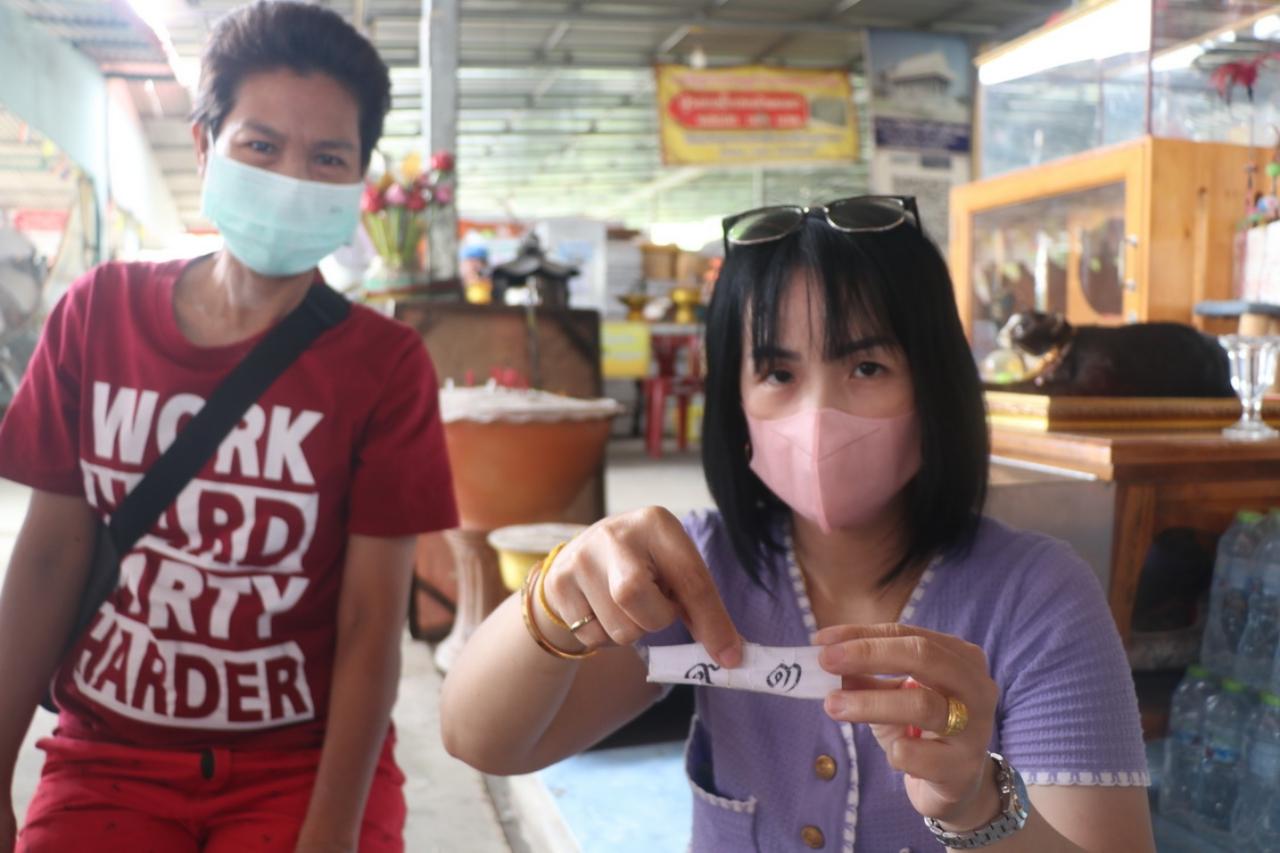 สำหรับงวดนี้พบว่า หญิงสาววัย 34 ปี ชาวกรุงเทพฯ ที่เดินทางมาท่องเที่ยวพร้อมครอบครัว ได้ขอตัวเลขเสี่ยงทายจาก แมวมารวย โดยการนำกระดาษเขียนตัวเลข 0-9 จำนวน 3 ชุด ใส่ไว้ในพาน แล้วให้แมวมารวยคาบตัวเลขออกมา