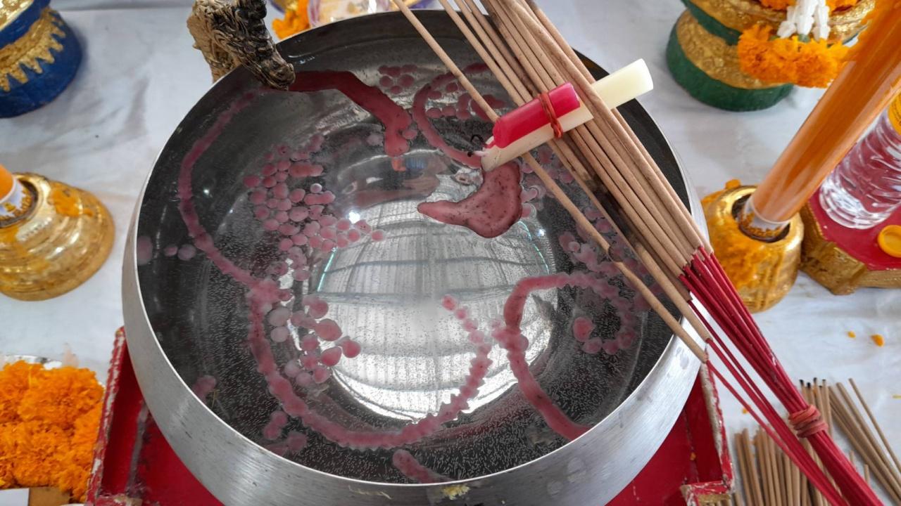 หลังพิธีเสร็จแล้ว ทุกคนก็ไม่ลืมที่จะไปส่องขันน้ำมนต์ เพื่อดู "เลขเด็ด" จากน้ำตาเทียน โดยมีคนเห็นเป็นเลข 3, 5, 8 และ 6 ซึ่งก็แล้วแต่คนจะมอง ขณะนี้ธูปมงคล ปรากฏเลข 392,293 นักเสี่ยงโชคก็ไม่พลาดที่จะซื้อลอตเตอรี่งวดวันที่ 1 ก.ค. 66 ไว้เสี่ยงโชค.