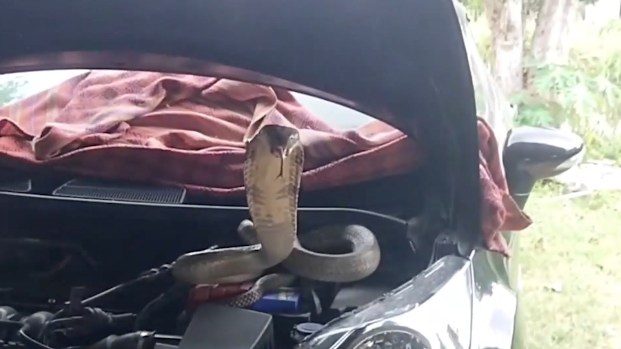 เมื่อไปถึงพบว่าเป็นงูจงอางตัวใหญ่ นอนขดตัวอยู่หน้ารถเก๋ง จึงเข้าไปจับ แต่งูเลื้อยหนีเข้าไปในห้องเครื่องรถเก๋ง เจ้าของรถต้อนเลื่อนรถออกไปที่โล่งๆ เปิดฝากระโปรงรถจับงูออกมาได้ในที่สุด โดยใช้เวลาประมาณ 5 นาที วัดความยาวได้ 3 เมตร
