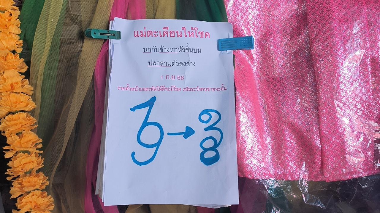 เมื่อไปถึงก็พบว่าต้นตะเคียนดังกล่าว มีกระดาษข้อความติดอยู่ เป็นประโยคปริศนาว่า "นกกับช้างหกหัวขึ้นบน ปลาสามตัวลงล่าง" พร้อมกับมีตัวเลขเขียนกำกับไว้ คือ 109 และ 38 บรรดาคอหวยจึงพากันยกโทรศัพท์ถ่ายภาพเก็บไว้ เพื่อนำไปซื้อเลขเด็ดตามแผงลอตเตอรี่แถวบ้านต่อไป.