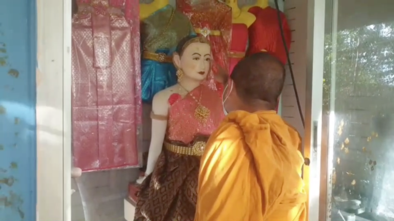 โดยคณะพระมหาอารยนันต์ อานันโท เจ้าอาวาสวัดเขาพระทอง เข้ากราบไหว้บนบานขอโชคลาภ พร้อมกล่าวบนบาน หากคณะที่เดินทางมาท่องเที่ยวต่างกราบไหว้บนบานเจ้าแม่เกาะนางโดย โชคดีถูกลอตเตอรี่รางวัลที่ 1 จะบริจาคเงินมาร่วมบูรณะซ่อมแซมศาลเจ้าแม่เกาะนางโดย และพัฒนาปรับปรุงภูมิทัศน์บนเกาะนางโดยให้สวยงามกว่านี้