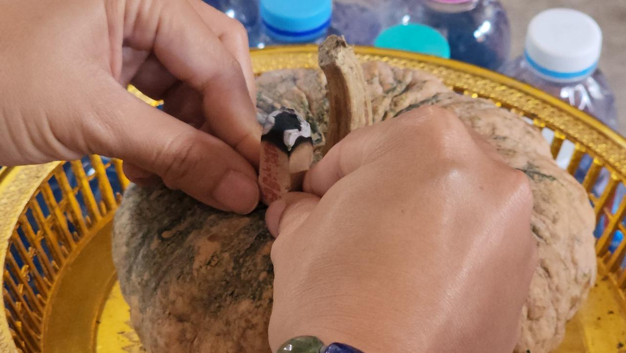 น.ส.เกสินี ยังเผยอีกว่า ในเมื่อได้สร้างพระแจกแล้ว ในส่วนตัวยังคิดว่าในเมื่อมาแล้วก็ถือโอกาสขอโชคลาภไปด้วย โดยนำธูปมงคลมาจุดปักที่บนฟักทองและบนบานศาลกล่าวขอให้ประสบผลสำเร็จในชีวิตทำสิ่งใดก็ขออย่าติดขัดและให้มีโชคลาภ อยากมีคลินิกเป็นของตนเอง ขอโชคใหญ่จุดธูป หากได้โชคใหญ่จะมาทำบุญครั้งใหญ่ให้หลวงพ่อแป๊ะและองค์พระตรีมูรติด้วย แล้วหันไปดูเลขธูปมงคลที่ไหม้หมดดอก ปรากฏว่าได้เลข 065 แต่หลายคนที่มาดูเห็นเป็นเลข 055 จากนั้นได้ขอตัวไปหาซื้อลอตเตอรี่ตามแผงที่มีเลขธูปมงคลก่อนเดินทางกลับ.
