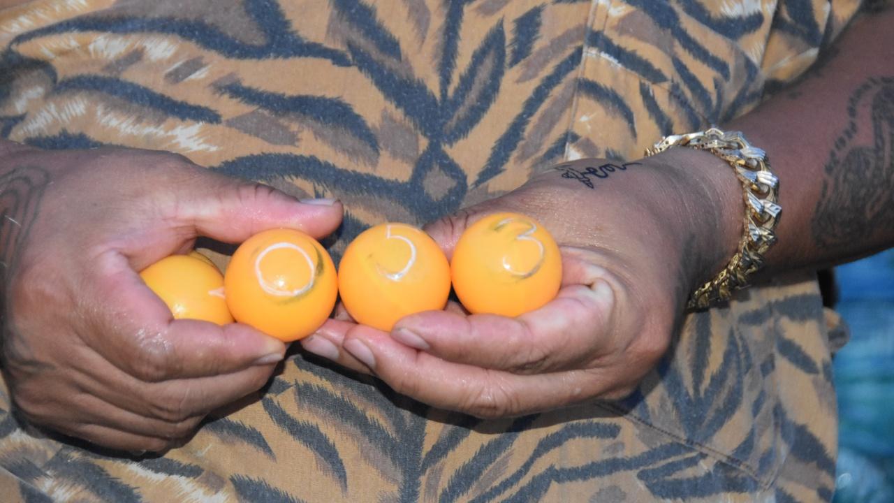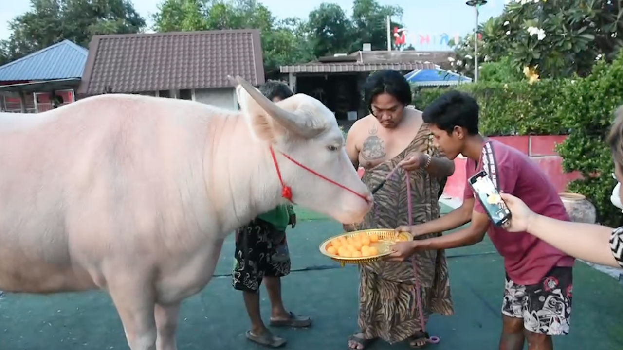 จากนั้นก็ให้เจ้าพลายสยาม ควายเผือกที่มีสีขาวเผือกอมชมพูทั้งตัว ส่วนเขาควาย และเล็บ ขาวเงาเป็นแก้ว พู่หางสีทอง ตรงตามตำรา ให้ทำการเสี่ยงทายโดยการใช้ลิ้นตวัดลูกปิงปอง ให้หล่นออกมา 5 ลูก ได้เลข 053 และ 17 ก่อนจะนำไปเสี่ยงโชคต่อไปงวด 1/11/99