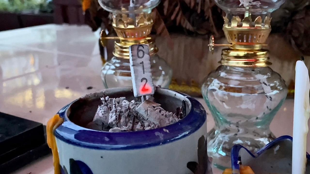 จากนั้นก็ได้ส่องเลขเด็ด ที่ปรากฏอยู่ธูปพญานาคที่ปักไว้ เห็นเป็นเลข 612 อย่างชัดเจน จึงรีบนำโทรศัพท์ขึ้นมาถ่ายรูป เพื่อนำไปซื้อลอตเตอรี่ ทั้งยังบอกอีกว่าหางเลข 2 ซึ่งเป็นเลขตัวสุดท้ายก่อนที่แสงธูปสีแดงจะดับลงนั้น ยังคล้ายกับพญานาคอย่างน่าประหลาดใจอีกด้วย.