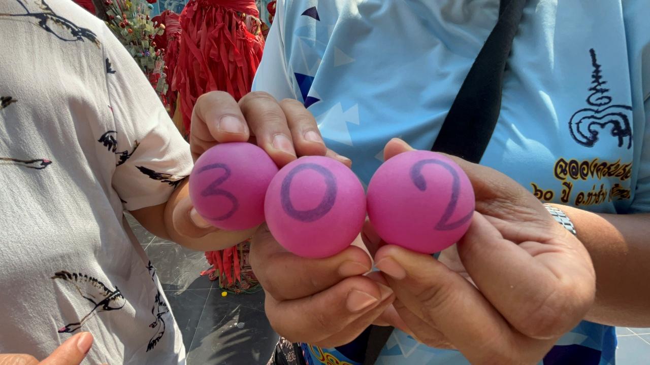 ซึ่งพอตนนำไปตีเลข ปรากฏว่าไปตรงกับเลขที่จับได้ในไหปิงปอง เลข 09 และ 063 ถูกทั้งบนและล่างในงวด 1 กุมภาพันธ์ที่ผ่านมา ได้โชคมาก้อนโต และยังได้โชคการงานมาอย่างต่อเนื่อง วันนี้จึงได้นำน้ำแดง ดอกกุหลาบ และ เครื่องเซ่นไหว้นำมาแก้บน พร้อมกับล้วงไหปิงปองอีกครั้ง ได้เลข 302 ซึ่งจะนำกลับไปเสี่ยงโชค.