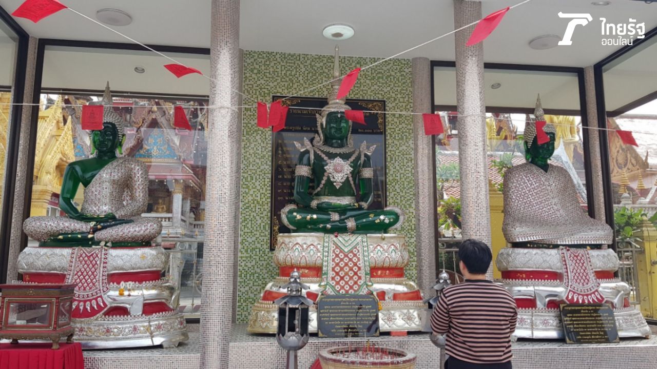 จากนั้น "หญิง" ได้เดินมายังบริเวณด้านหน้าพระอุโบสถ ซึ่งเป็นสถานที่ประดิษฐาน "พระแก้วมรกตจำลอง" รวมไปถึงพระพิฆเนศ และ องค์ท้าวเวสสุวรรณ โดยเริ่มแรกให้จุดธูป 3 ดอกเพื่อบูชาพระแก้วมรกตจำลอง