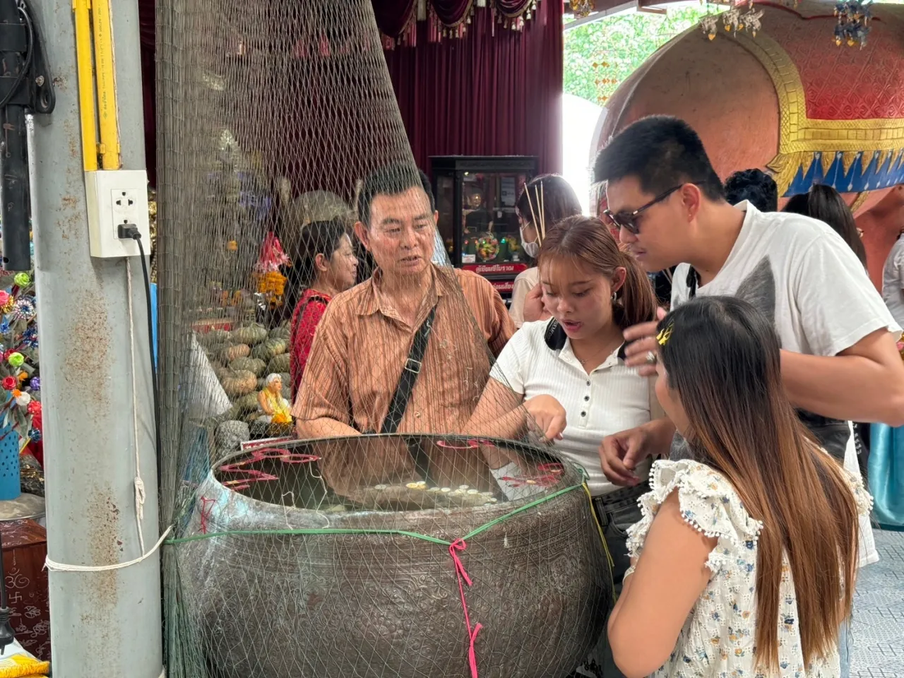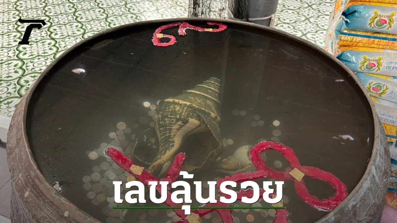 คนแต่งชุดไทยขอโชค "กุมารทองเจ้าสัวเฮง" อาศรมฤาษีเณร หลังรับโชคหลายงวดติด ไม่ลืมส่อง "เลขเด็ดงวดนี้" ในอ่างน้ำมนต์ เห็นน้ำตาเทียนลอยจับกลุ่ม