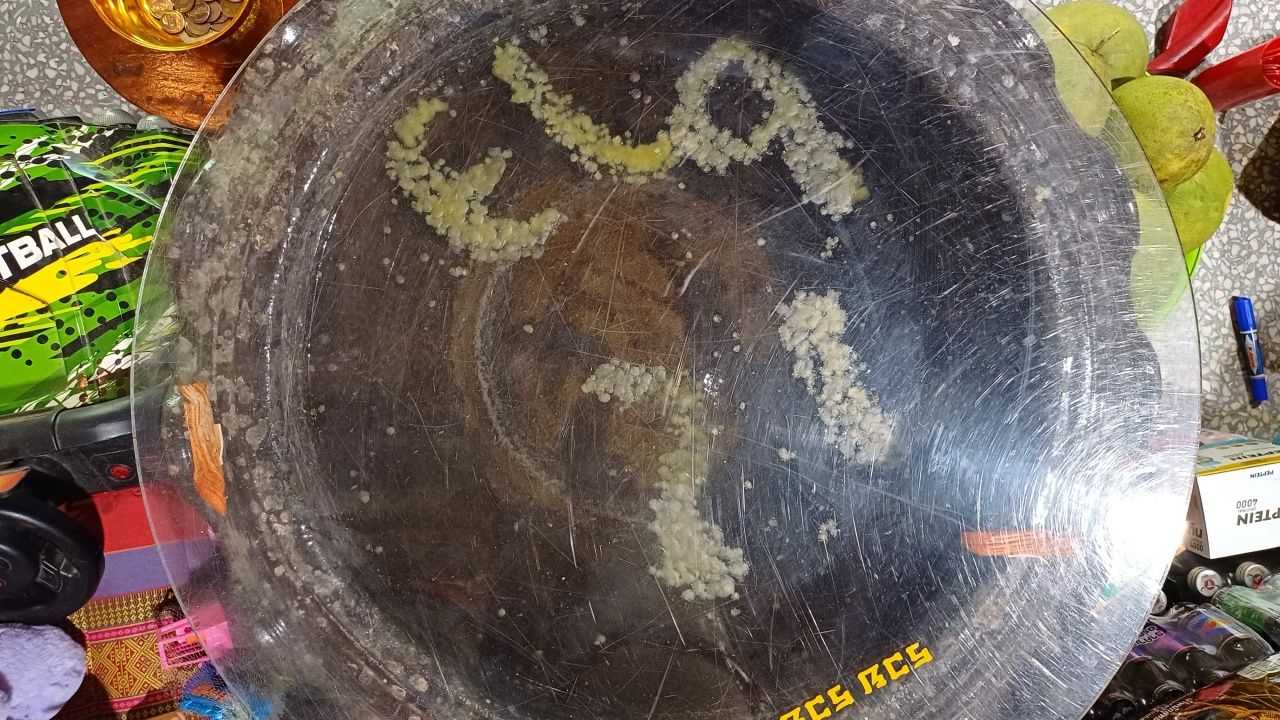 จากนั้นก็หันไปดูที่อ่างน้ำมนต์ ภายในมีหยดน้ำตาเทียน เห็นเป็นเลข 1, 2, 6, 7, 3 ได้นำกล้องถ่ายภาพไว้ และหยิบกระบอกเซียมซีขึ้นอธิษฐานขอโชคกับตาทองอีก เขย่าให้ไม้หล่น 3 ไม้ ปรากฏว่า ได้เลข 9 เลข 14 เลข 6 ยกมือธิษฐานอีกครั้ง ขอให้รวยจะนำสิ่งของที่ตาทองชอบมาให้เต็มที่ แล้วเดินทางกลับ