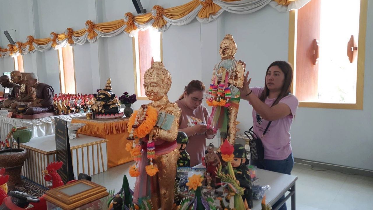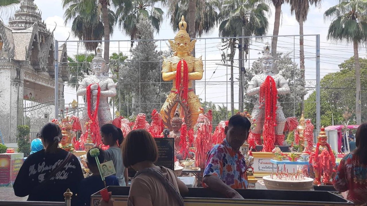 เมื่อวันที่ 22 เม.ย. 67 ที่วัดมงคลรัตน์ คลอง 12 ต.ลำไทร อ.ลำลูกกา จ.ปทุมธานี พบว่ามีสายมูต่างเดินทางมากราบไหว้องค์หลวงพ่อแก้วนิมิตรมงคล พระเบญจมงคล ซึ่งเป็นพระพุทธรูปศักดิ์สิทธิ์ภายในวัด และไหว้ขอพรท้าวเวสสุวรรณ พ่อปู่ลำไทร แม่วิมาลาตะเคียนเก่าอายุกว่า 200 ปี และพญาครุฑมหาบารมี คึกคักตั้งแต่ช่วงเช้า โดยในงวดนี้พบคนนำชุดไทยสีเขียวมาถวายแม่วิมาลา หลังได้โชคมาแล้วกว่า 10 งวด