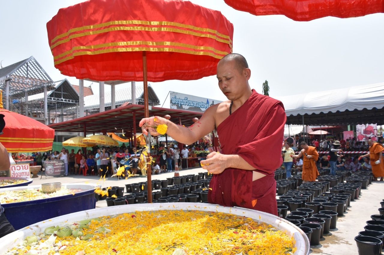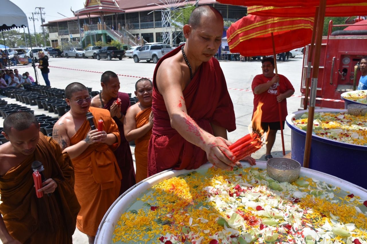 โดยหลวงปู่ดุสิตได้มีการบริกรรมคาถาลงในแท็งก์น้ำมนต์ที่มีกลีบบัว ดอกดาวเรือง ผลมะกรูด พร้อมทั้งหยดน้ำตาเทียนลงในแท็งก์ทุกแท็งก์ จากนั้นบรรดาลูกศิษย์ได้เดินต่อแถวให้พระสงฆ์ 5 รูป รดน้ำมนต์ จนเปียกชุ่ม ตามความเชื่อเพื่อสร้างกำลังใจในการกลับไปประกอบอาชีพ โดยหลังบริกรรมคาถาเสกน้ำมนต์แล้วมีการจุดประทัด ปรากฏเลขหางประทัด 90 และ 825 ซึ่งคอหวยก็ไม่พลาดที่จะได้นำไปเสี่ยงโชคตามความเชื่อ ในงวด 16/5/67 นี้ด้วย