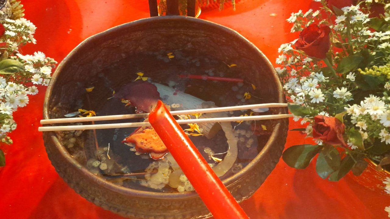 สำหรับขันน้ำมนต์ พิธีบวงสรวงท้าวเวสสุวรรณ มีพระอาจารย์พรศักดิ์ ฐานุตุตโร เจ้าแห่งนาคาประธานทรัพย์เป็นประธานฝ่ายสงฆ์ได้จุดเทียนในขันน้ำมนต์ พอเสร็จพิธีคนชอบเสี่ยงโชคได้ตามส่องหาตัวเลข โดยในขันน้ำมนต์เทียนมีลักษณะคล้ายเป็นเศียรพญานาค โดยคนชอบหวยบอกว่า มีเลข 0, 5, 7, 9