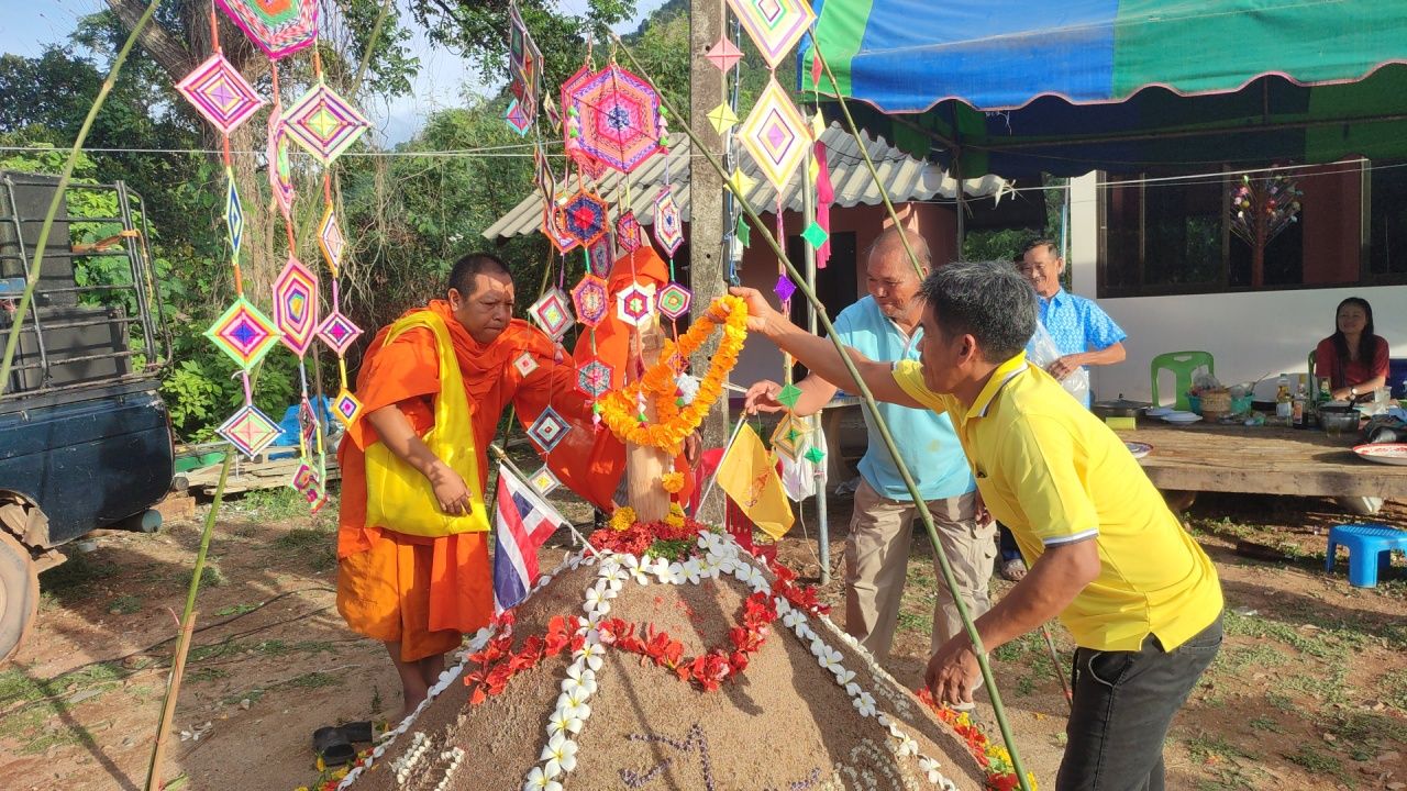 หลังจากนั้น ในตอนเช้าวันรุ่งขึ้นจะมีการสวดมนต์ ทำบุญเลี้ยงพระ ชาวบ้านจะนำอาหารคาวหวานมาถวายพระ แล้วพระจะสวดมนต์เจริญน้ำพระพุทธมนต์ที่เจดีย์ทรายลงไปปัดเป่าความไม่ดีออกไป เสร็จแล้วจุดธูปเทียน กล่าวส่งทางให้หมดทุกข์ หมดโศก และสิ่งที่ไม่ดีทั้งหลายหมดไป มีแต่สิ่งที่ดีๆ เข้ามาในชีวิตเป็นอันเสร็จพิธี ก็จะนำน้ำมนต์ไปดื่มกินแก้โรคภัยและเป็นสิริมงคลภายในครัวเรือนของตน