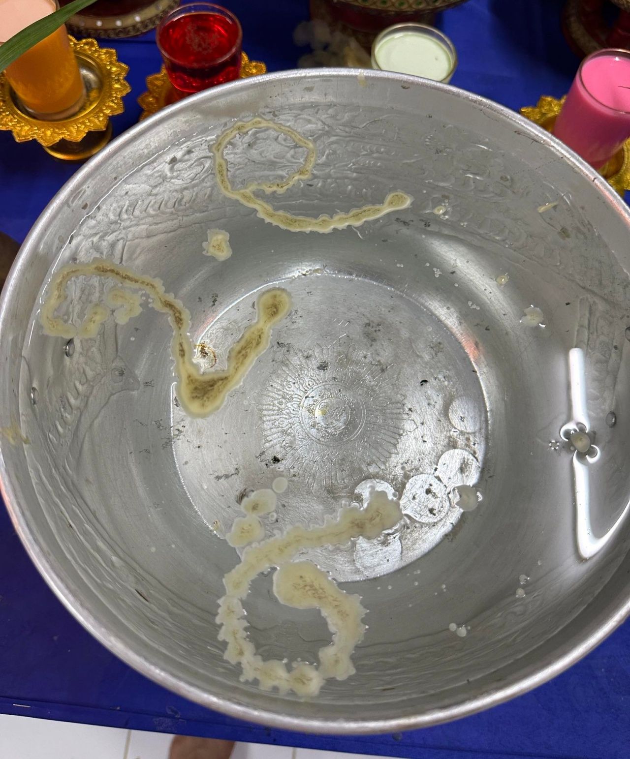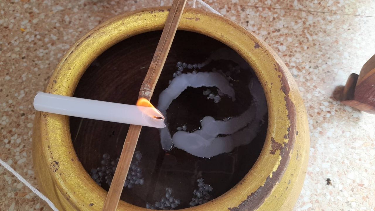 ในการประกอบพิธีครั้งนี้ หลวงพ่อแป๊ะ ได้นำเทียนมาจุดที่ขอบอ่างน้ำมนต์ เพื่อให้น้ำตาเทียนหยดลงในอ่างในระหว่างที่พระสวด เมื่อเสร็จสิ้นพิธีแล้วก็จะเอาน้ำมนต์มาอาบให้กับสาธุชนที่ต้องการ และที่ฮือฮาก่อนจะอาบน้ำมนต์ บรรดาผู้ที่เข้าร่วมพิธีต่างมาขอมุงดูหยดน้ำตาเทียนในอ่างน้ำมนต์ ที่หลวงพ่อแป๊ะประกอบพิธี เพื่อจะนำไปเสี่ยงโชคลาภ ปรากฏว่าหลายคนมีความเห็นตรงกันว่า เห็นเป็นเลข 22, 76 และ 101