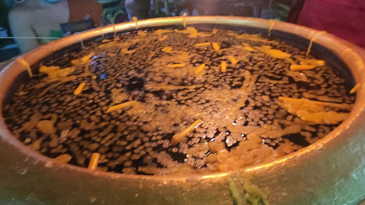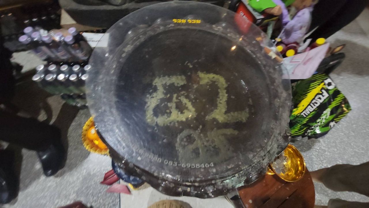 โดยในงวดนี้มีคนดวงเฮงก้มมองในอ่างน้ำมนต์ศักดิ์สิทธิ์ เห็นเป็นเลข 7 6 และ 5 6 ลอยขึ้นมา ขณะที่แผงลอตเตอรี่ที่มาขายภายในวัด ร่วม 80 แผง ตามแผงต่างๆ จะมีการเขียนกระดาษติดเอาไว้ ระบุข้อความเป็นเลขกำลังวันอาทิตย์วันหวยออก 16 มิ.ย. 67 เลข 9 1 8 และเลขหยดน้ำตาเทียนในอ่างน้ำมนต์ 7 0 3, 85 และ 302 เขียนติดไว้เกือบทุกแผง