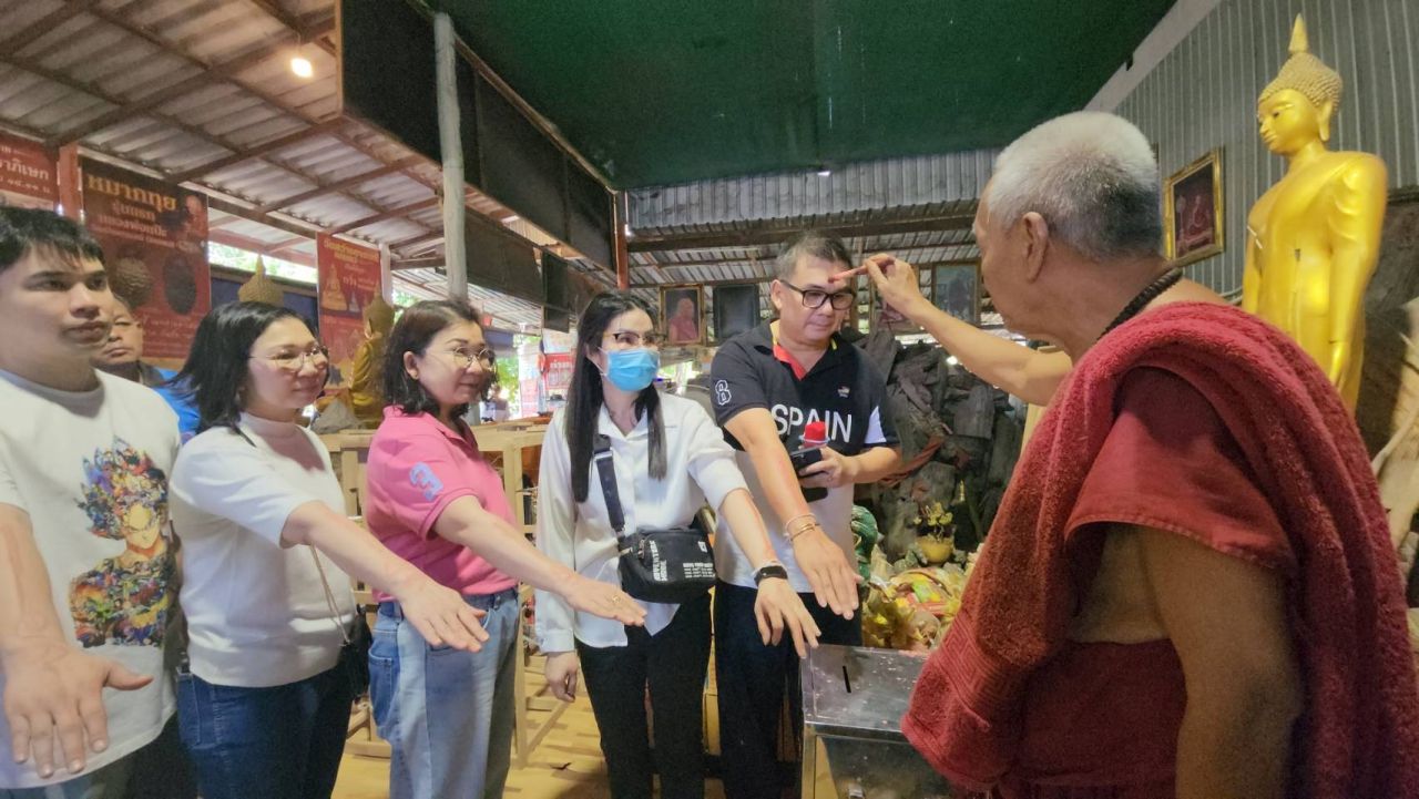 ก่อนที่จะเดินทางกลับได้เข้าพบหลวงพ่อแป๊ะอีกครั้ง ขณะที่หลวงพ่อแป๊ะกำลังลงอักขระยันต์หลังมือให้กับสาธุชนและศิษยานุศิษย์ น.ส.ธัญดา และสามีจึงขอต่อแถวลงอักขระยันต์ด้วยเพื่อเป็นสิริมงคล หลังเสร็จสิ้นหลวงพ่อแป๊ะะยังได้มอบวัตถุมงคลและผ้ายันต์ ให้กับสามีและภรรยาด้วย