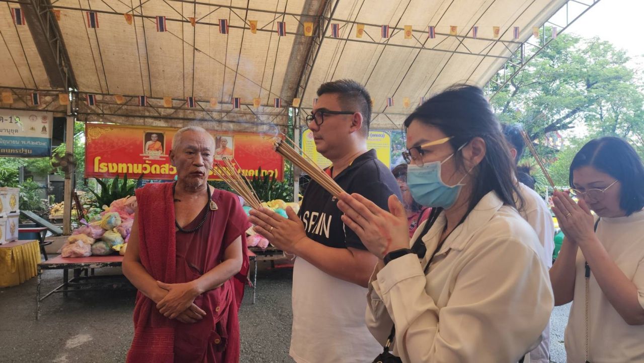 วันที่ 21 มิ.ย. 67 ที่วัดสว่างอารมณ์ แคแถว ต.ขุนแก้ว อ.นครชัยศรี จังหวัดนครปฐม พบ นายภวัต คมกฤตเกษมไชย อายุ 52 ปี และนางสาวธัญดา จิรากรนิธิทัต อายุ 46 ปี สองสามีภรรยาเจ้าของโรงงานจำหน่ายเนื้อสุกร บริษัท ธัญดาพอร์ค โอเค จำกัด ตั้งอยู่ ต.บ่อพลับ อ.เมืองนครปฐม นำคนงานร่วม 10 คนได้นำเนื้อหมู กระดูกหมู หมูสับ หมูชิ้น ไส้ เครื่องใน ชิ้นส่วนต่างๆ มาใส่รถบรรทุก 6 ล้อ มาถวายเข้าโรงทานวัดสว่างอารมณ์ จำนวน 3 ตัน หรือน้ำหนัก 3,000 กิโลกรัม เพื่อทำอาหารเลี้ยงสาธุชนที่จะมาร่วมพิธีไหว้ครูพ่อปู่ฤาษีองค์บรมครูของวัดสว่างอารมณ์ ที่จะมีขึ้นในวันที่ 22-23 มิ.ย. 67 โดยนำเรียงรายไว้บนโต๊ะด้านหน้าองค์พ่อปู่ฤาษี สร้างความสนใจให้กับผู้ที่เดินทางมากราบไหว้สิ่งศักดิ์สิทธิ์ภายในวัดต่างมารุมดู