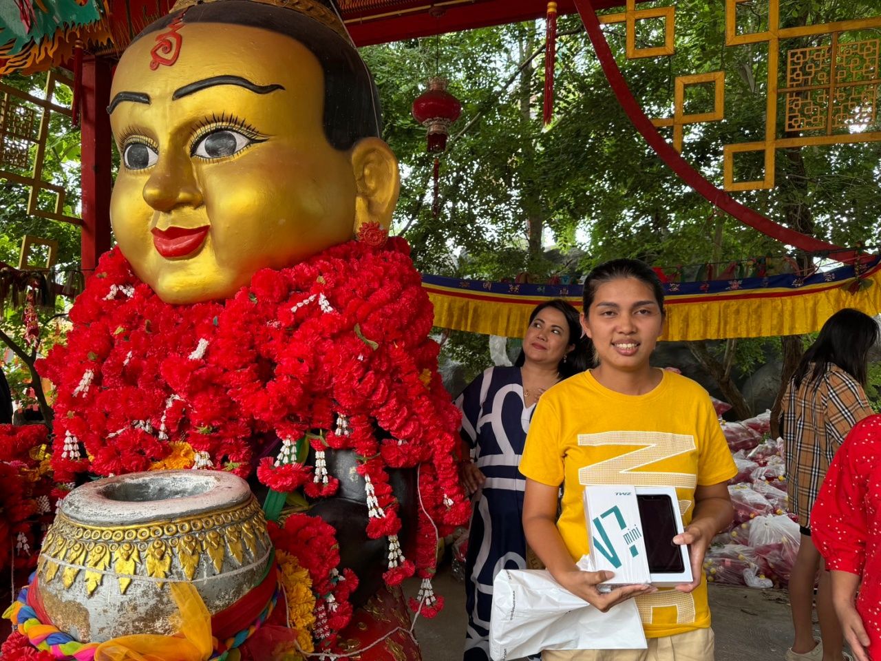 ซึ่งวันนี้มี น.ส.สมใจ ถ้ำหงษ์ อายุ 28 ปี ชาวจังหวัดสระบุรี นำโทรศัพท์มือถือแอนดรอยด์ มาถวายกุมารทองเจ้าสัวเฮง หลังได้โชคหลักแสน 2 งวดติด