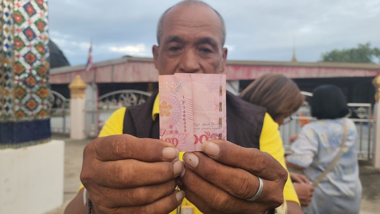 นอจากนี้ ยังได้รับธนบัตรขวัญถุง แจกให้กับชาวบ้านที่มาต้อนรับทุกคนกลับบ้านอีก เรียกว่ามาแต่ละครั้งจะต้องได้โชคติดมือทุกครั้งไป ซึ่งธนบัตรครั้งนี้ได้เป็นแบงก์ 100 ซึ่งตนเองถือว่าหลวงพ่อให้โชคมา พร้อมโชว์ธนบัตรได้หมายเลข 1 F 7 4 8 6 3 5 5 ตนเองจะนำเลขไปเสี่ยงโชค อาจได้โชคก้อนโตก็ได้.