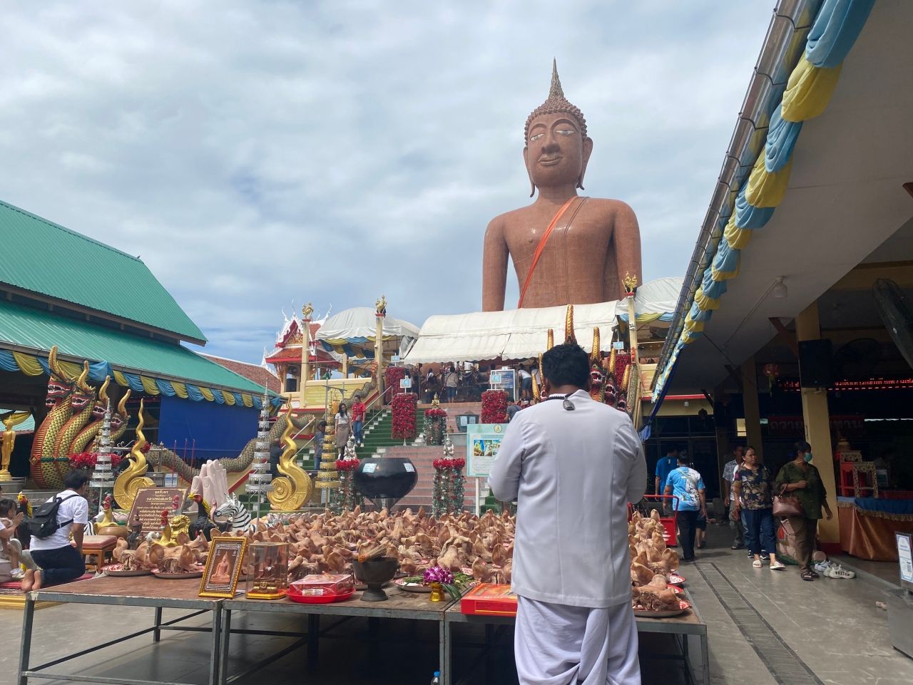 เมื่อวันที่ 22 ก.ค. 67 ที่วัดกลางบางพระ (หลวงพ่อสมหวัง) ต.บางพระ อ.นครชัยศรี จ.นครปฐม ได้มีสองสามีภรรยา ชาวเจ็ดเสมียน อ.โพธาราม จ.ราชบุรี ได้นำหัวหมูต้มพะโล้ 100 หัว น้ำดื่ม 100 แพ็ก ไข่ไก่สด 20 แผง พร้อมประทัด 1 หมื่นนัด ใส่รถบรรทุก 6 ล้อ นำมาถวายแก้บนหลวงพ่อสมหวัง หลังถูกรางวัลที่ 2 รับ 1 ล้านบาท