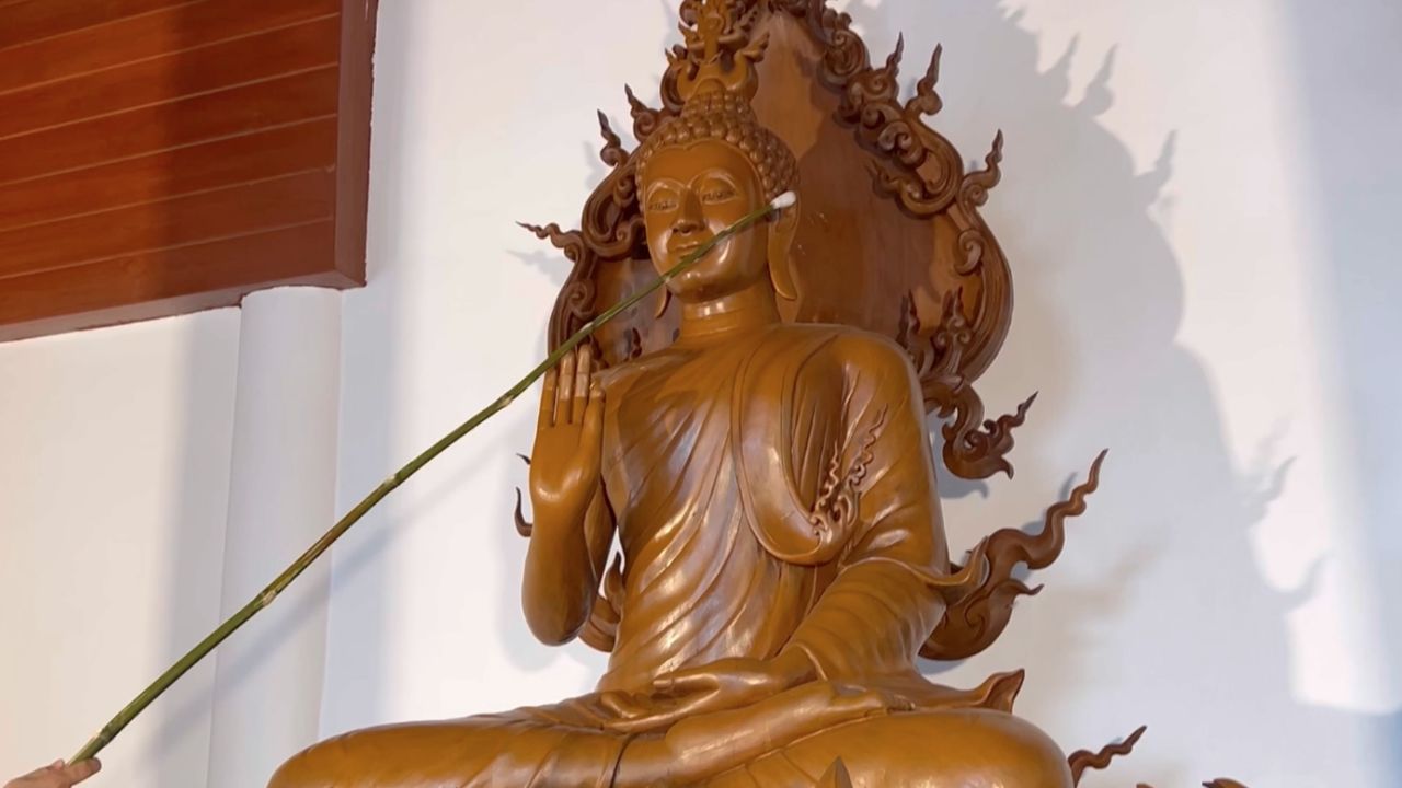เมื่อวันที่ 24 ก.ค. 67 ที่วัดนังคัลจันตรี คลอง 7 ต.บึงคำพร้อย อ.ลำลูกกา จ.ปทุมธานี ได้มีการประกอบพิธีบวงสรวงเบิกเนตรพระพุทธอัศนีศรีศาสดา หรือ หลวงพ่อสายฟ้า ซึ่งเป็นต้นตะเคียนทองเก่าแก่ อายุ 200 กว่าปี ที่ถูกฟ้าผ่าแล้วจึงนำมาแกะสลัก เป็นพระพุทธรูปปางประทานพร มีความสูง 4 เมตร หน้าตักกว้าง 49 นิ้ว
