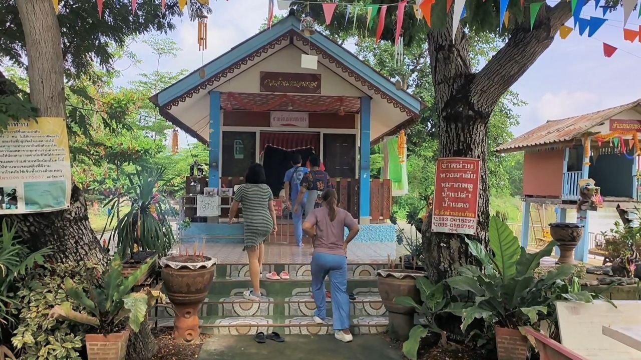 โดยได้นำ หมากพลู พวงมาลัย เข้ามากราบไหว้ เพื่อขอโชคลาภจากเจ้าแม่หมอนทอง ซึ่งบางคนได้ทำการล้วงไข่ และอีกหลายๆ คนได้ทำการจุดธูปเสี่ยงทาย และได้นั่งรอลุ้นจนปรากฏตัวเลข 342 จึงได้ถ่ายภาพเก็บไว้เพื่อไปหาซื้อลอตเตอรี่ในตลาดสดต่อไป