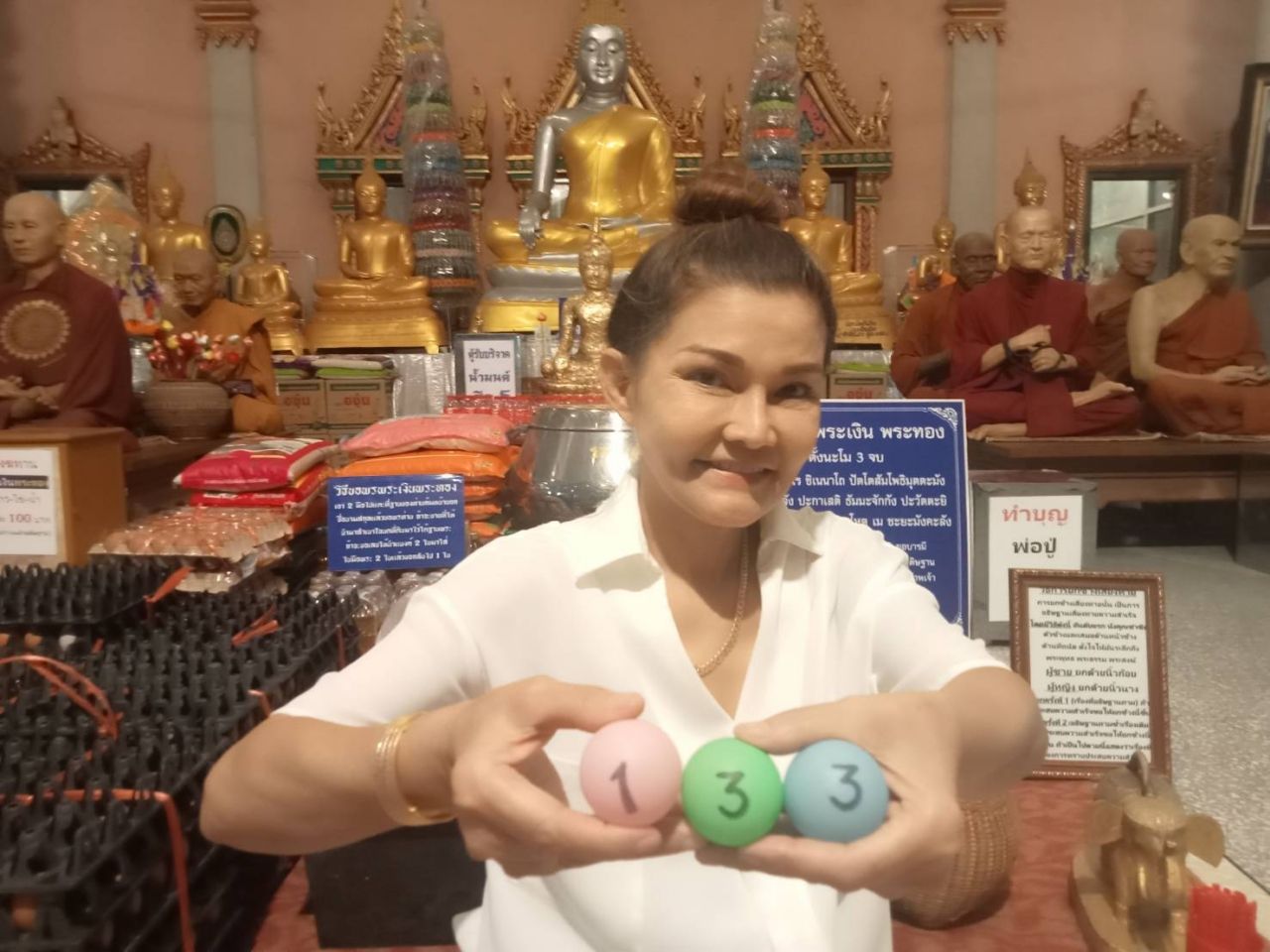 น.ส.ธนพร ยังบอกอีกว่าไหนๆ ก็มาแล้วเลยถือโอกาสขอโชคลาภจากพระเงินพระทอง กลับไปด้วย จากนั้นก็เดินไปยกมือกราบไหว้ขอโชคลาภอีกครั้งหนึ่ง พร้อมกับหยิบกระบุงที่ใส่ลูกปิงปอง เขย่า หยิบขึ้นมา 3 ลูก ปรากฏว่าได้เลข 133 พร้อมกับพนมมือบอกกล่าวหากได้โชคใหญ่จะกลับมาทำบัญถวายปัจจัยเลี้ยงพระ และนำทั้งข้าวสาร และไข่ น้ำดื่ม มาถวายอีก ก่อนเดินทางกลับได้เดินไปหาซื้อลอตเตอรี่ตามแผงต่างๆ ภายในวัดแล้วกลับบ้าน.