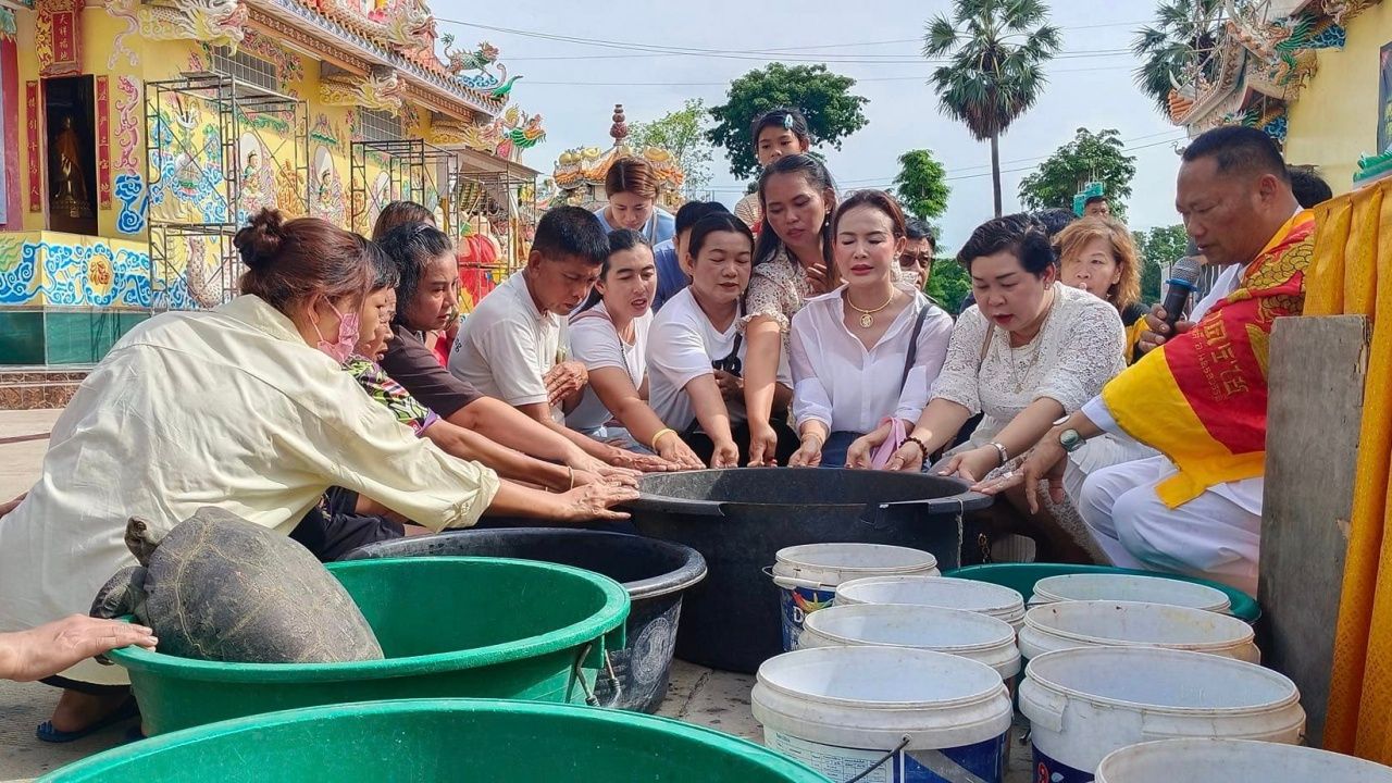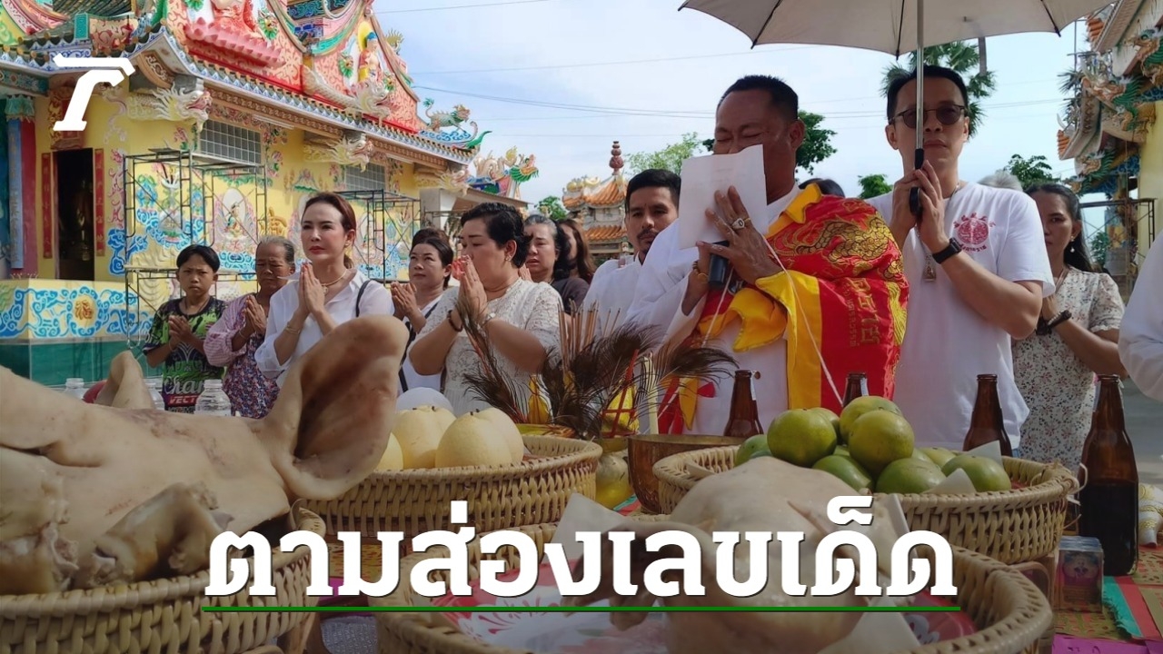 ส่วนพิธีในศาล นอกจากจะมีการกราบไหว้ขอพรเพื่อเป็นสิริมงคลแล้ว บางคนก็นำมะม่วง ทุเรียน และน้ำดื่ม มาร่วมถวายเพื่อเป็นทานให้กับผู้ที่มาร่วมพิธีในวันนี้ และสิ่งหนึ่งที่ขาดไม่ได้ก็คือ การจุดประทัด ตัวเลขจากปลายประทัดวันนี้ ได้แก่ หมายเลข 44 และ 979 โดยหวังว่าจะมีโชคในงวดวันที่ 1 กันยายน ที่จะถึง.
