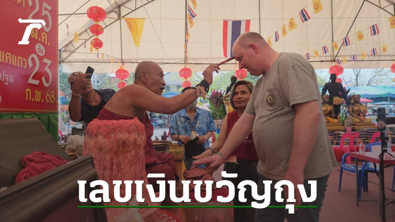 สาวไทยควงสามีชาวต่างชาติมาลงยันต์กับ "หลวงพ่อแป๊ะ" วัดสว่างอารมณ์ ไม่ผิดหวังได้ "เลขเด็ด" จากธนบัตรเงินขวัญถุงกลับไปลุ้นโชค งวด 16/2/68