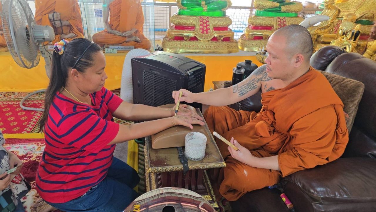 เมื่อผู้สื่อข่าวไปถึงภายในวัด พบชาวบ้านปูเสื่อนอนรอจองคิวกันเป็นจำนวนมาก เต็มพื้นที่ทั้งในศาลา และลานหน้าวัด เพื่อรอเวลากดบัตรคิว ในการทำพิธีครั้งนี้ ซึ่งโดยก่อนหน้านี้มีสองผัวเมีย อาชีพเป็นกู้ภัยและสัปเหร่อ ได้มาทำพิธีเจิมหน้าและเจิมมือกับพระอาจารย์เอ้เป็นครั้งแรก จากนั้นได้นำยันต์บนฝ่ามือไปตีเป็นเลข และซื้อสลากกินแบ่งรัฐบาลไว้จำนวน 2 ใบ หวังเพียงถูกรางวัลเลขท้าย 2 ตัว และ 3 ตัว แต่กลับถูกรางวัลที่ 3 รับเงินประมาณ 160,000 บาท