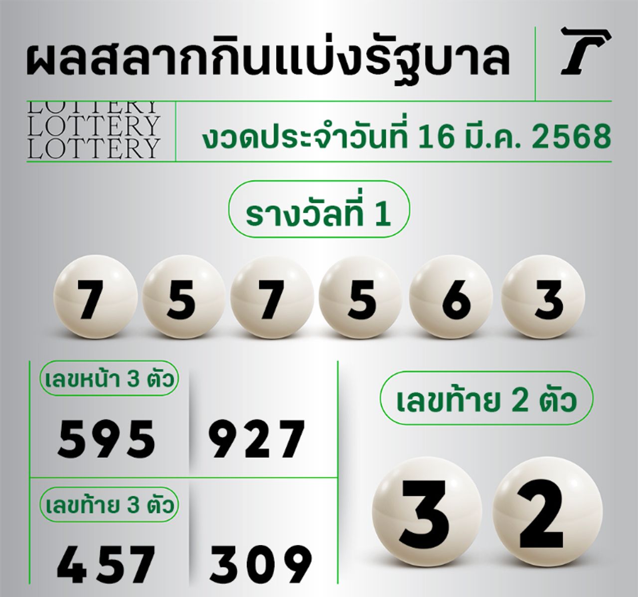 (ตรวจสลากกินแบ่งรัฐบาล งวดวันที่ 16 มี.ค. 2568 ทุกรางวัลที่นี่)