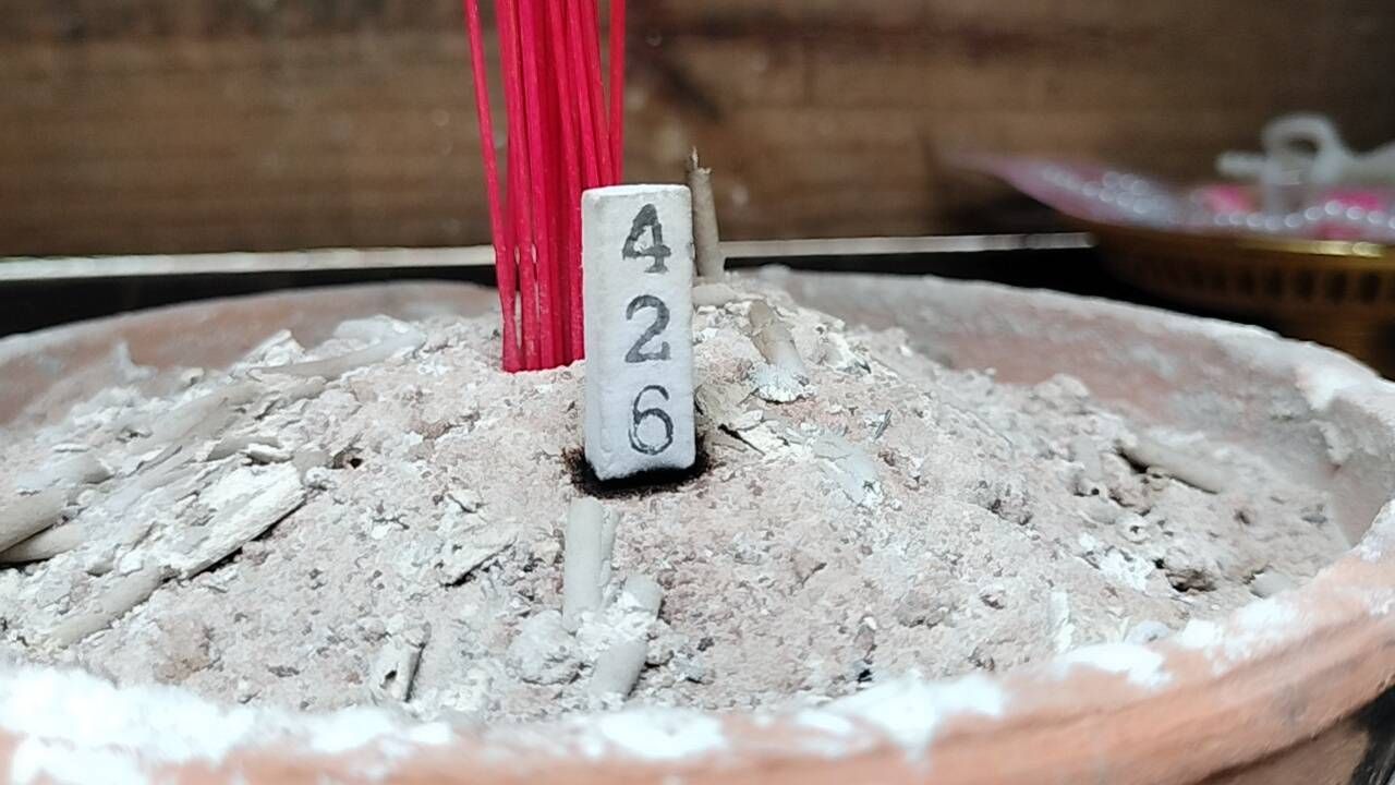ขณะที่ อาจารย์เริงมาช่วยทำพิธีขอโชคลาภแล้วหยดน้ำตาเทียนสีแดงลงขันน้ำมนต์ โดยมีตัวเลขโผล่ชัด ซึ่งมีทั้งหมด 4 ตัว ที่ปรากฏอยู่ในขันน้ำมนต์ คือตัวเลข 4, 5, 7, 3 และได้จุดธูปเสี่ยงทายได้เลข 426