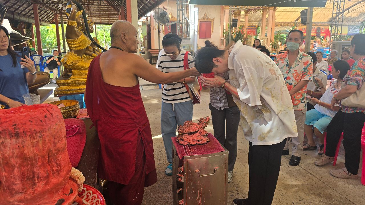 ในครั้งนี้ได้พบหลวงพ่อแป๊ะสมใจ จึงถวายสังฆทาน สาวน้ำตาเทียน ลงยันต์หลังมือ และยังได้กราบไหว้พระเงินพระทอง องค์ครูบนศาลาการเปรียญ ขอพร ขอโชคลาภ ให้กับครอบครัว และได้เขย่าเซียมซีขอเลขเด็ดให้กับแฟนคลับ