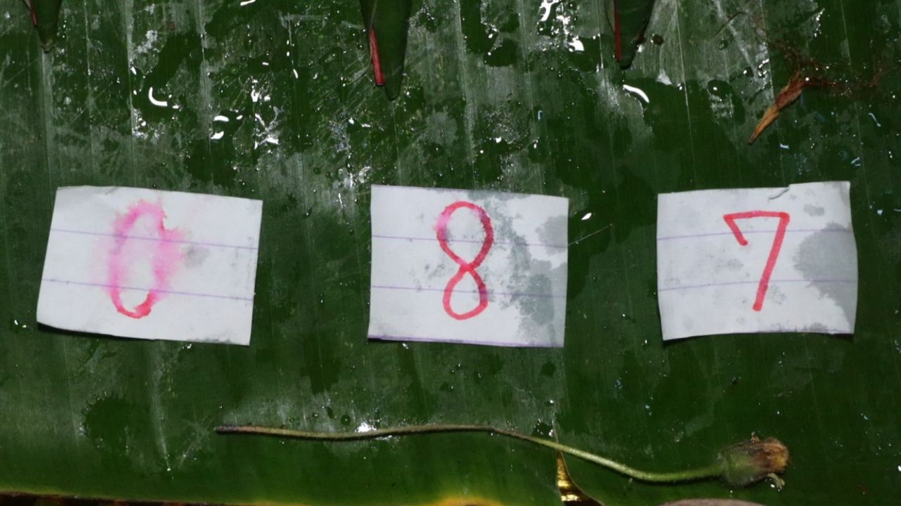 หลังจากนักเสี่ยงดวงทำพิธีขอเลขเสี่ยงทายตามความเชื่อแล้ว ปรากฏว่าได้ฝนโปรยปรายลงมาพร้อมกับพญาบึ้งได้คีบตัวเลขขึ้นมาไว้ที่ปากรู แบบเน้นๆ ครั้งละใบ จำนวน 3 ครั้ง เปิดออกดูพบเป็นตัวเลข 0 8 7 ซึ่งหลายคนจะนำไปเสี่ยงดวงในงวดนี้ 2/5/68.