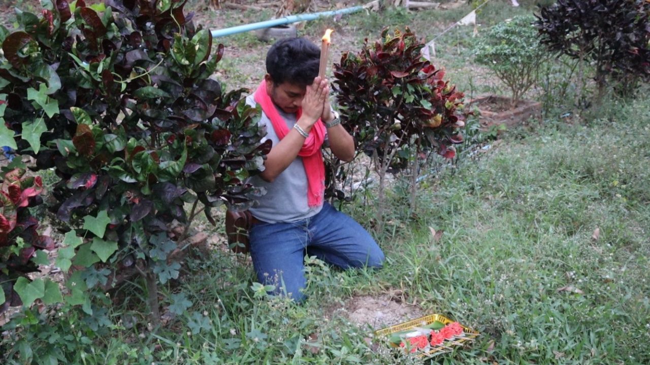 นักเสี่ยงดวงมาตามนัด ทำพิธีเสี่ยงทาย "พญาบึ้ง" หลังวัดโบสถ์ราชศรัทธา จ.อ่างทอง ตามความเชื่อ แม้มีฝนโปรยปรายแต่ไม่ผิดหวัง ยิ้มได้ "เลขเด็ด" มาเสี่ยงโชคสมใจ