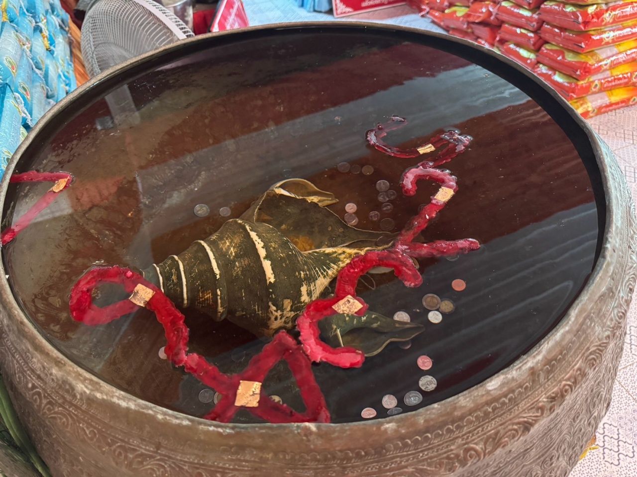 และที่นักเสี่ยงโชคไม่พลาดเลยคือ การส่องเลขเด็ดในอ่างน้ำมนต์บนศาลาบุญช่วยเพื่อนำไปเสี่ยงโชค ซึ่งปรากฏน้ำตาเทียนเป็นเลข 1 2 3 4 5 6 เวียนจับคู่กัน เรียกเทวะบันดาล