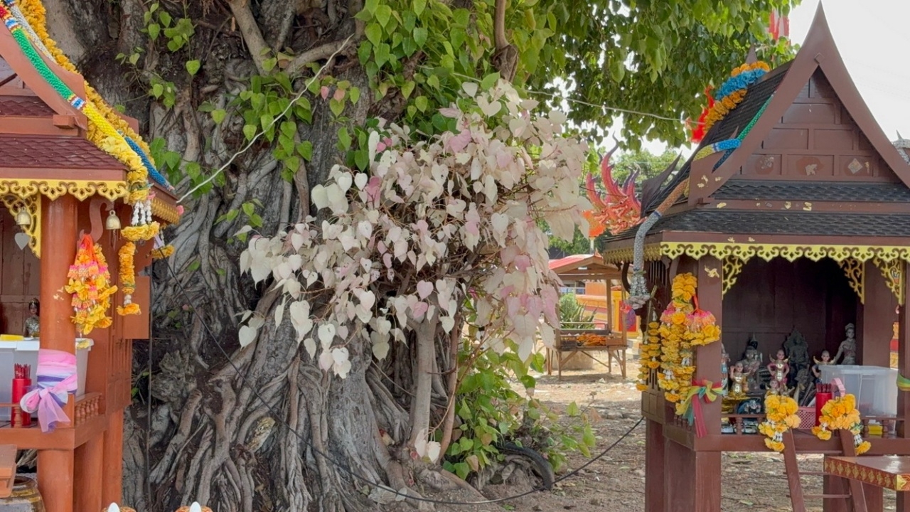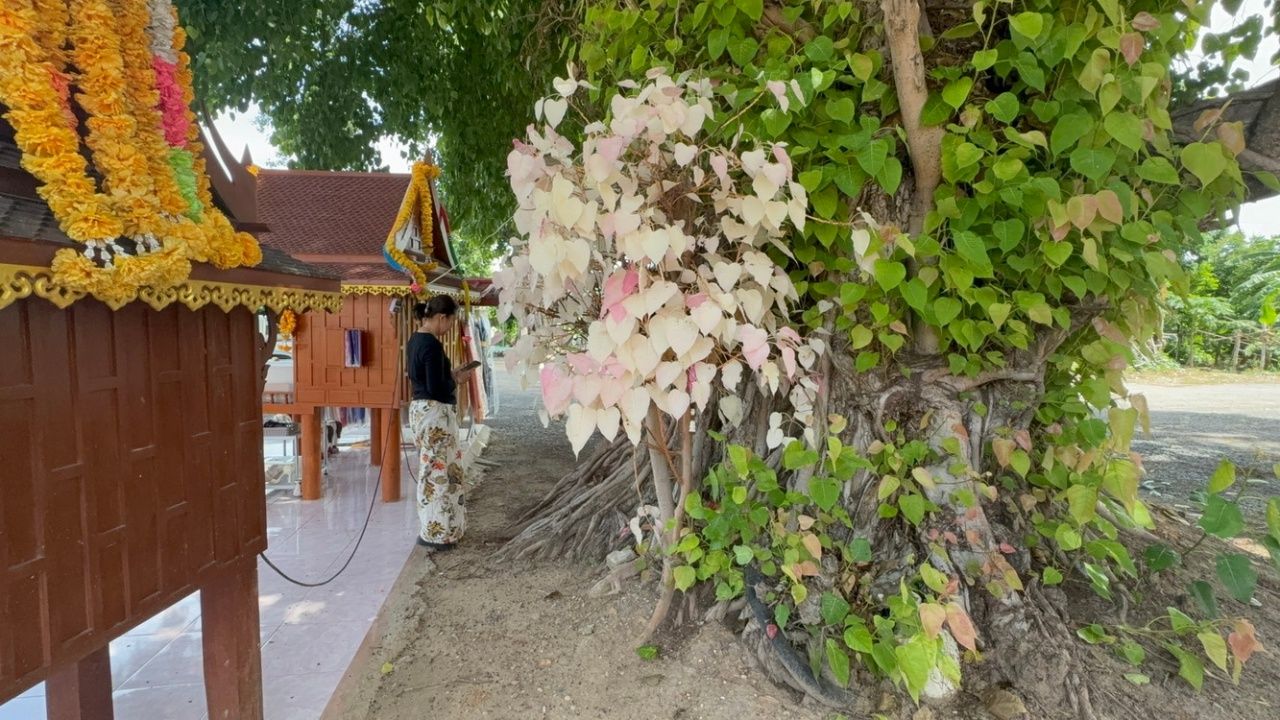 ขอพิสูจน์ให้เห็นกับตา ต้นโพธิ์ออกใบสีแปลกตา สีขาว-สีชมพู ที่โคนต้น ข้างโบสถ์วัดสีบัวทอง จ.อ่างทอง ไม่ลืมจุดธูปเสี่ยงทายได้เลขเด็ด 16/6/68 ลุ้นรวย