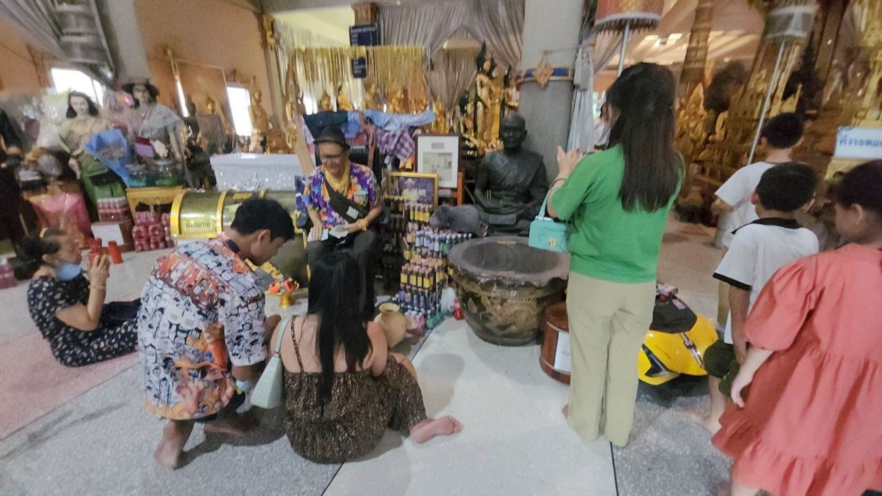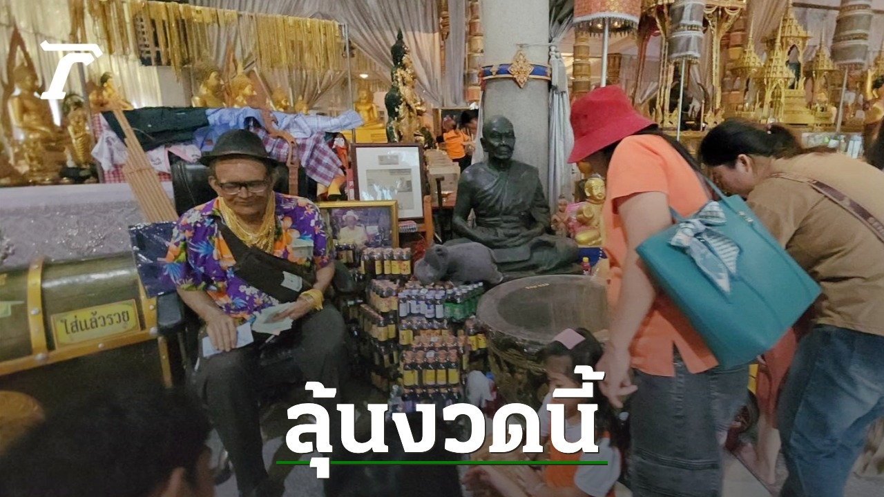 สาธุชนขอพร "ตาทองงิ้วราย" วัดสว่างอารมณ์ จ.นครปฐม คนตาดีไม่พลาดมอง "เลขเด็ด" น้ำตาเทียนลอยวนในอ่างน้ำมนต์ หวังนำเลขเด็ดเสี่ยงโชคงวดนี้ 1/7/68