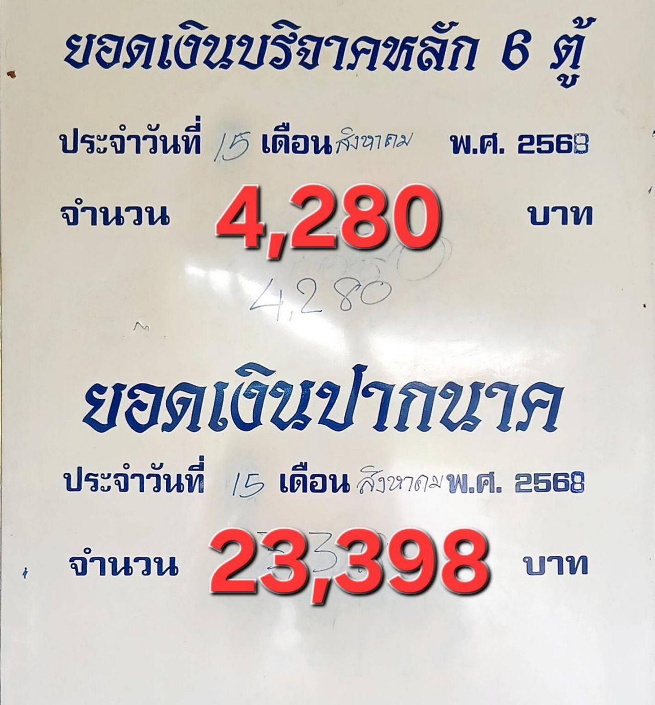 แต่ที่ไม่ต้องมองให้ลำบากสายตาคือเลขธูปเสี่ยงโชค งวดนี้ได้เลขสวย 404 นอกจากนี้ยังมีเลขยอดตัวเลขเงินปากนาคให้คนที่ชอบเสี่ยงดวงได้นำไปลุ้นกันตามความเชื่ออีกด้วย สำหรับยอดประจำวันที่ 15 สิงหาคม ได้จำนวน 4,280 บาท ส่วนยอดเงินปากนาคในงวดวันที่ 16 สิงหาคม 2568 ยอดรวมที่กรรมการนับได้เป็นเงิน 23,398 บาท