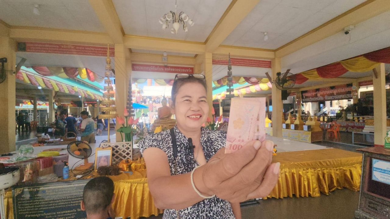 พร้อมกับควักธนบัตรฉบับละ 100 บาท ใบแรกมาเป็นเลขนำโชค พร้อมกับโชว์ให้ดูว่า ได้เลข 4 G 8112739 ยกมือพนมเหนือหัว ขอให้หลวงพ่อสมหวังให้โชคอีกสักครั้งแล้วจะกลับมานำทั้งหัวหมู ไข่ ข้าว น้ำดื่ม มาถวายให้อย่างเต็มที่ จากนั้นก็เดินไปหาซื้อล็อตเตอรี่ตามแผงต่างๆ ที่ตั้งขายอยู่ในบริเวณวัด ก่อนเดินทางกลับ.
