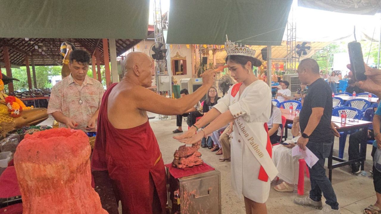 ในจำนวนสาธุชนที่มาทำบุญในวันนี้ มี น.ส. สุธาริณี ภัทรสุปรีดิ์ หรือน้องเบล Miss Chinese ภาคกลาง ซึ่งเป็นตัวแทนชนะการประกวดภาคกลางในนามของจังหวัดนครปฐม ไปประกวดระดับตัวแทนประเทศไทย ไปชิงชัยระดับชาติ เดินทางมากับครอบครัวและผู้จัดการคอยดูแล โดยแต่งตัวชุดราตรีสีขาวสวมมงกุฎที่ได้รางวัลมา สายสะพายพาดบ่า มารอเพื่อเข้าพิธีสาวน้ำตาเทียนและลงยันต์หลังมือกับหลวงพ่อแป๊ะ หลังพิธีเสร็จสิ้นหลวงพ่อแป๊ะได้ให้ขึ้นกราบไหว้ขอพร พระเงินพระทอง ก่อนไปชิงมงกุฎ นางงามมิสไชน่าระดับชาติ